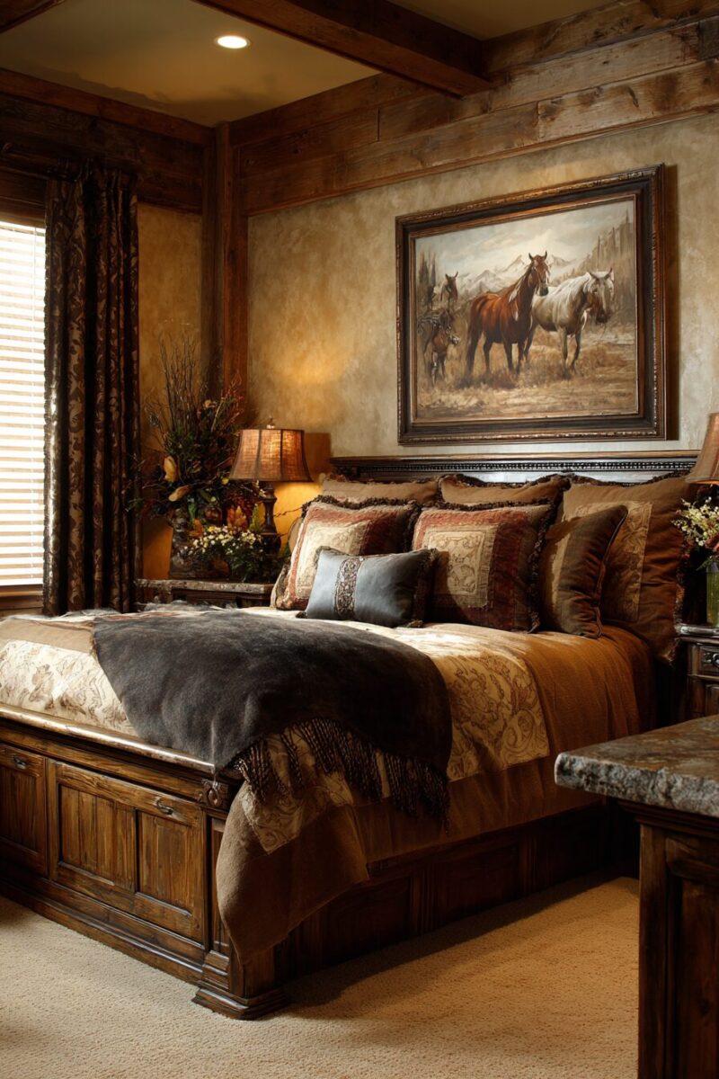 You’ll find that this backdrop serves as the perfect canvas for layering in cowhide throws, wool blankets, and other western textiles that complete the look.