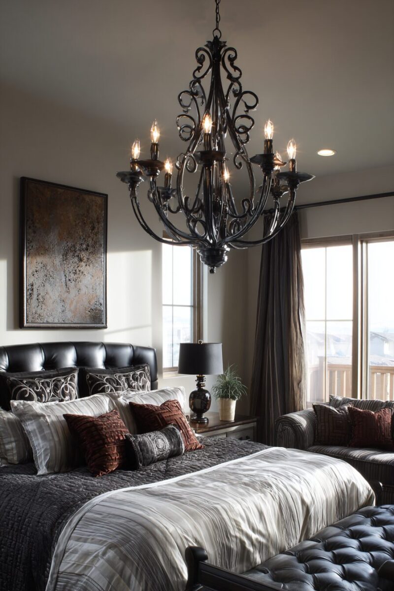 The dramatic silhouette of a black wrought iron chandelier creates stunning shadow patterns on your walls and ceiling, adding another layer of visual interest to your space.