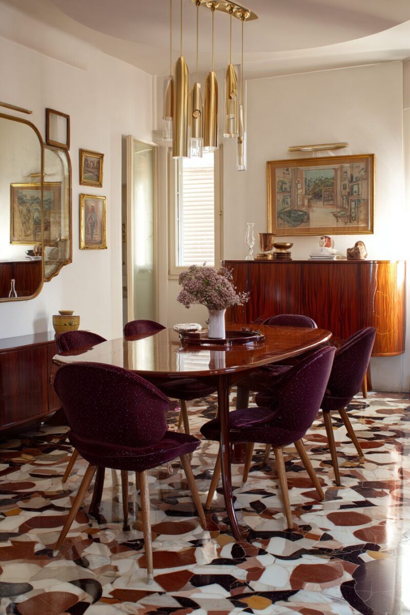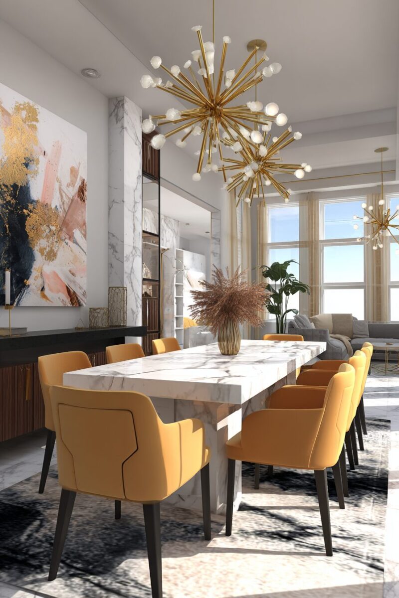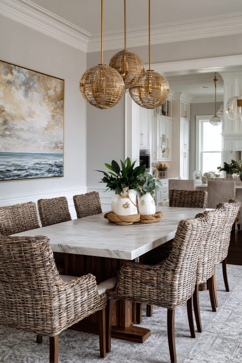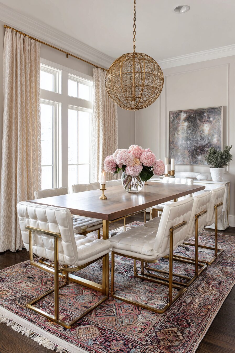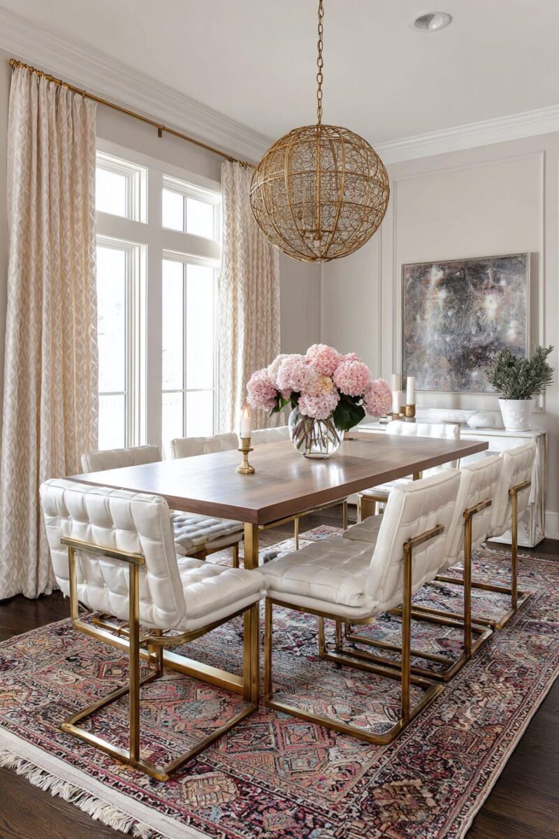 Accent the space with gold or brass details—think vases, napkin holders, or light fixtures.