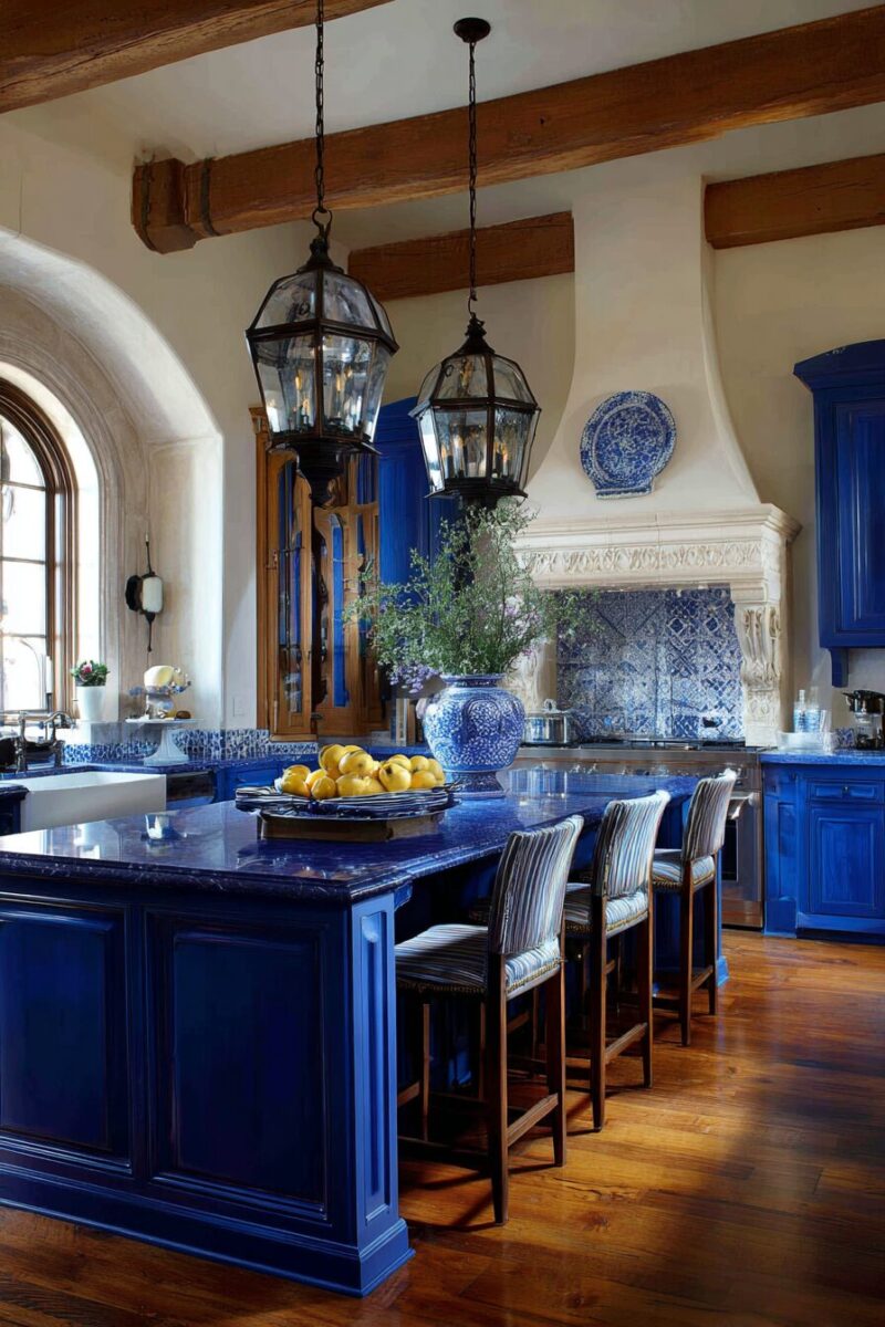 Nothing commands attention quite like a bold cobalt blue kitchen island that serves as the dramatic focal point of your entire space.
