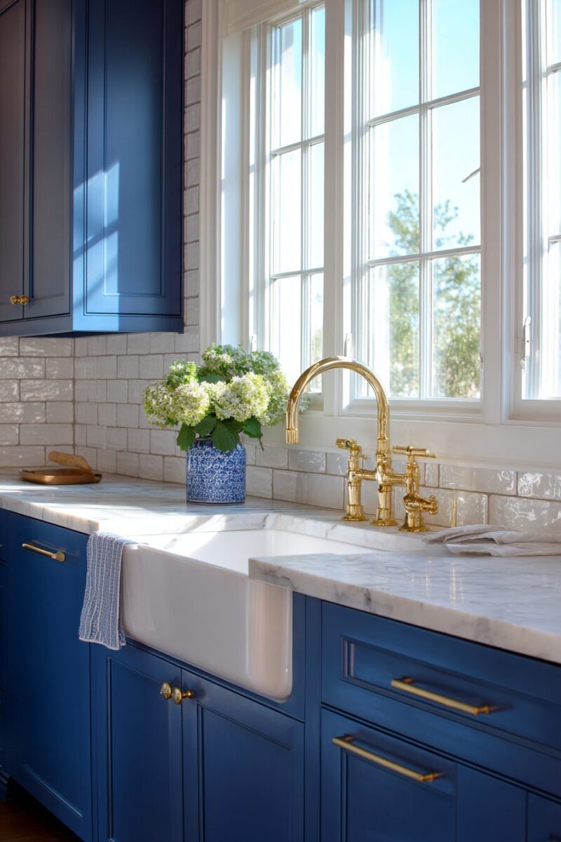 Your navy blue sink becomes the perfect backdrop for displaying beautiful dishware, fresh flowers, or herbs growing in vintage-style planters along the windowsill.