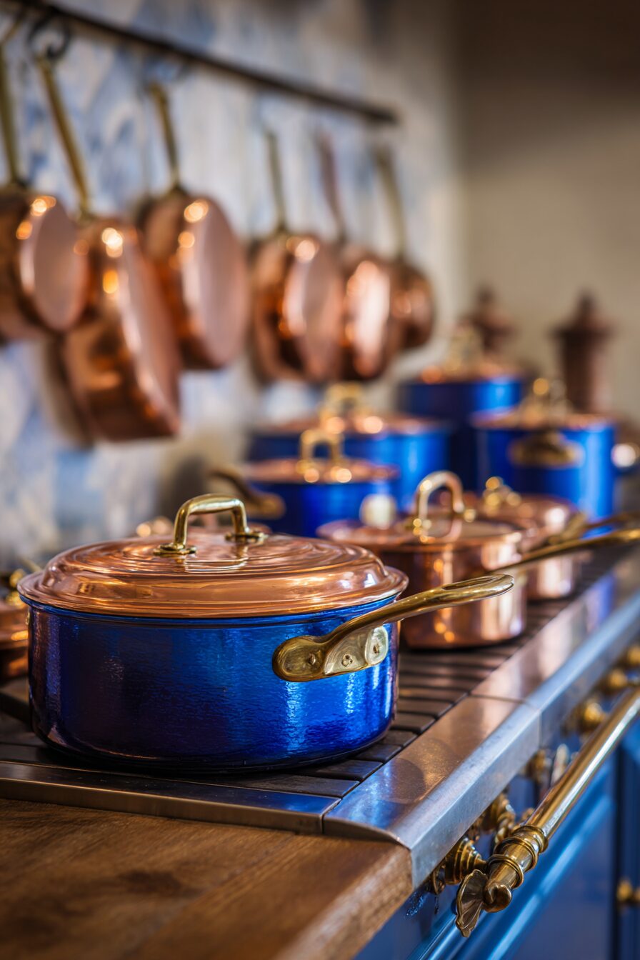 This distinctive cookware combines the timeless appeal of copper with charming blue enamel finishes that instantly transport your kitchen to a French countryside cottage.