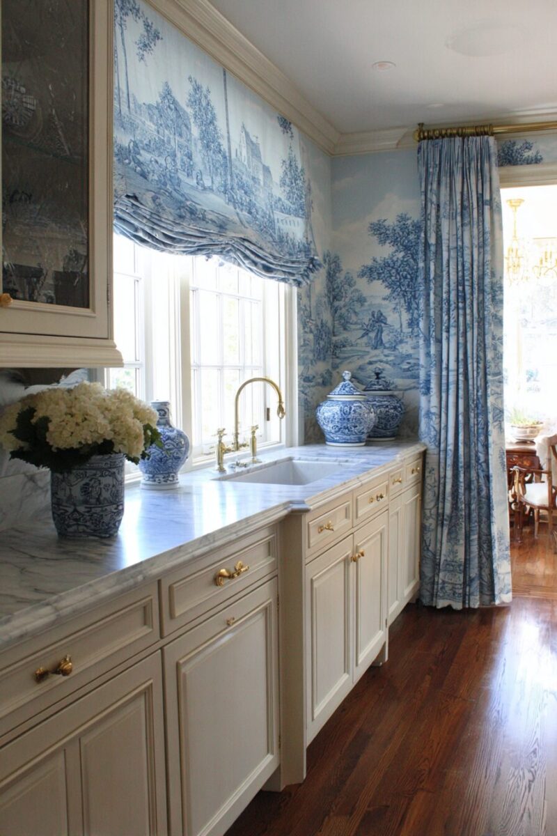 Your windows frame the outside world beautifully when you dress them in classic blue toile fabrics that bring French countryside charm directly into your kitchen space.