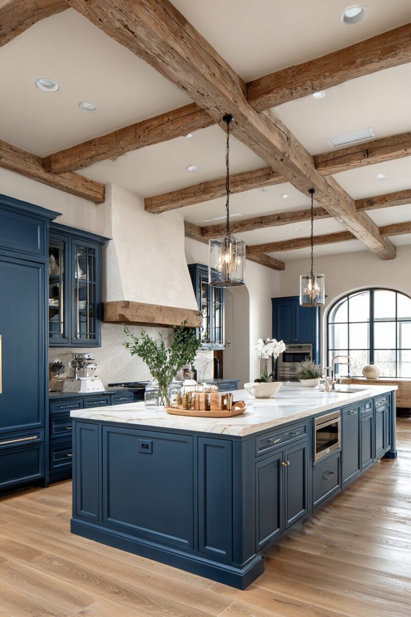 Your painted beams coordinate perfectly with other blue elements throughout your kitchen while establishing themselves as a unique design feature that guests will definitely notice and remember.