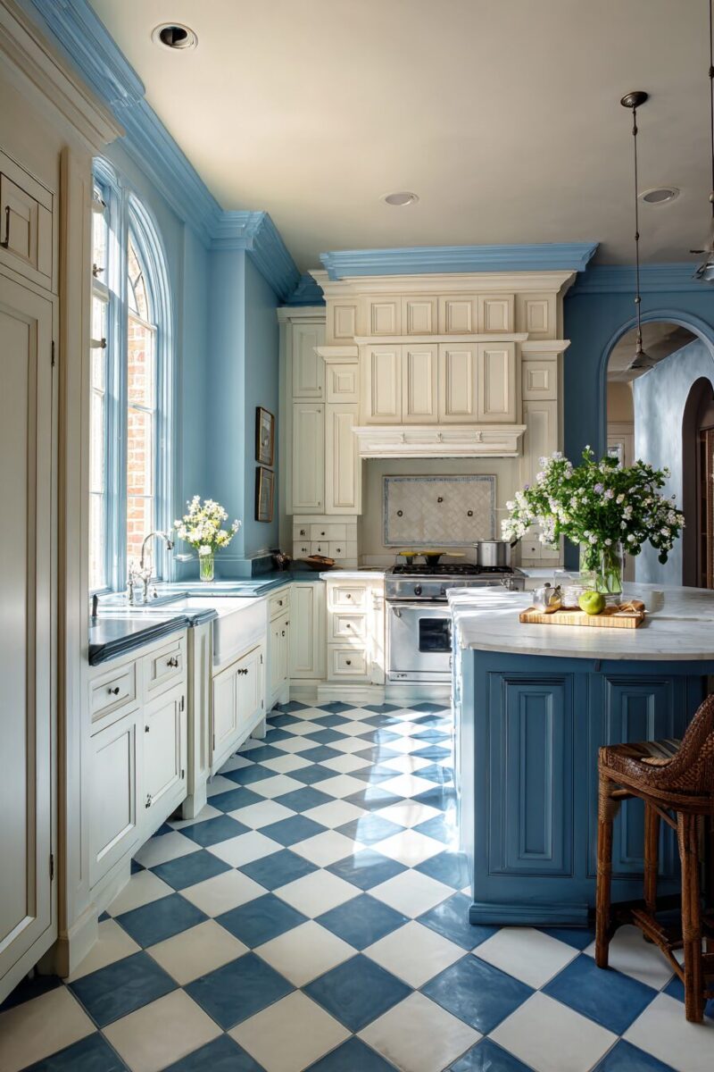 Your kitchen foundation becomes a work of art when you install a stunning blue and cream checkered floor that captures the timeless appeal of traditional French country design.