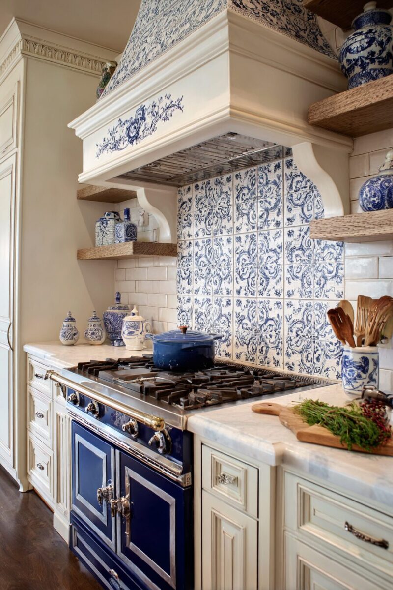 Your backsplash becomes a canvas for artistic expression when you choose stunning blue and white patterned tiles that capture the essence of French countryside charm.