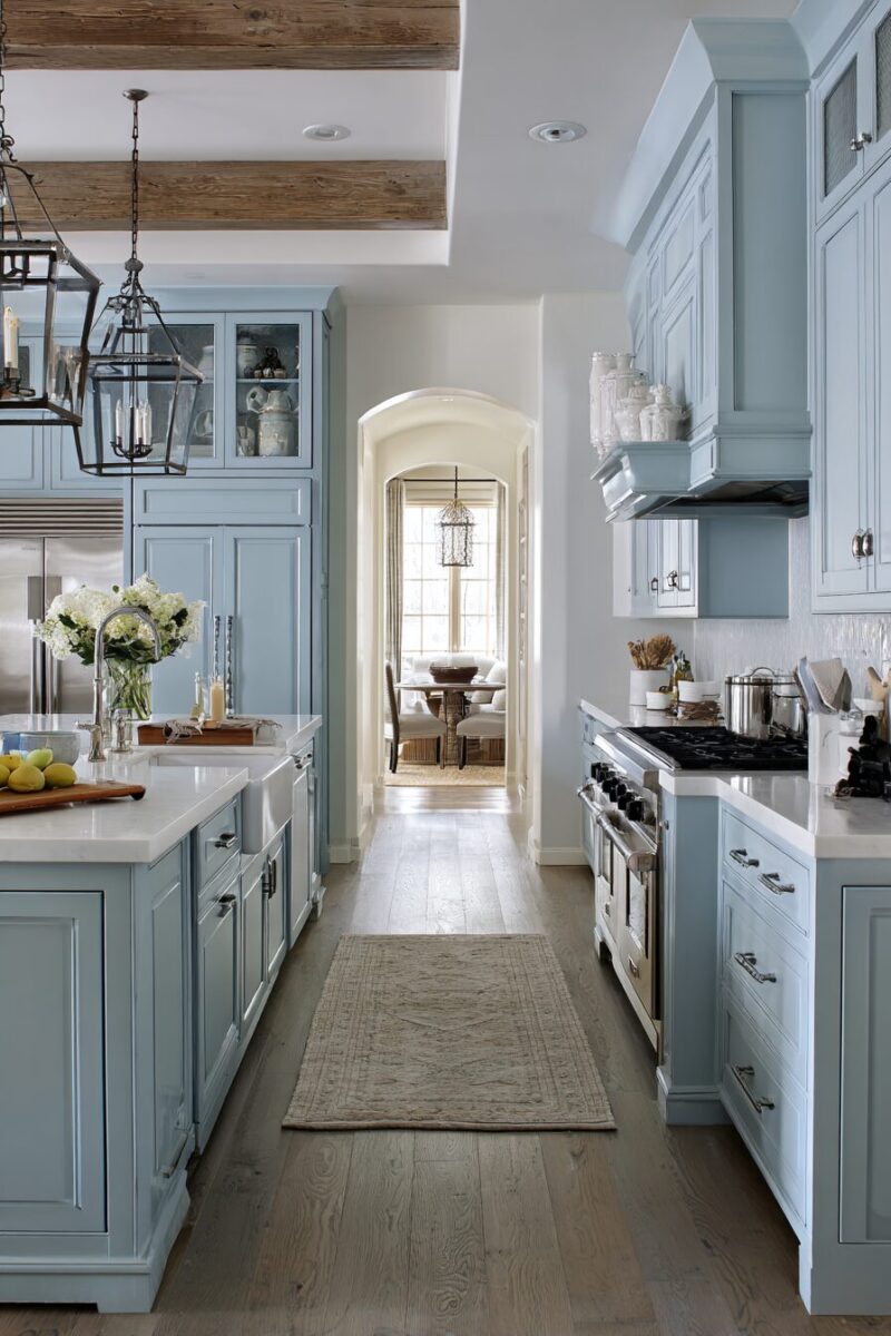 French country kitchens painted in various shades of blue create an atmosphere that’s both sophisticated and wonderfully lived-in, making your kitchen the heart of your home in the most authentic way possible.