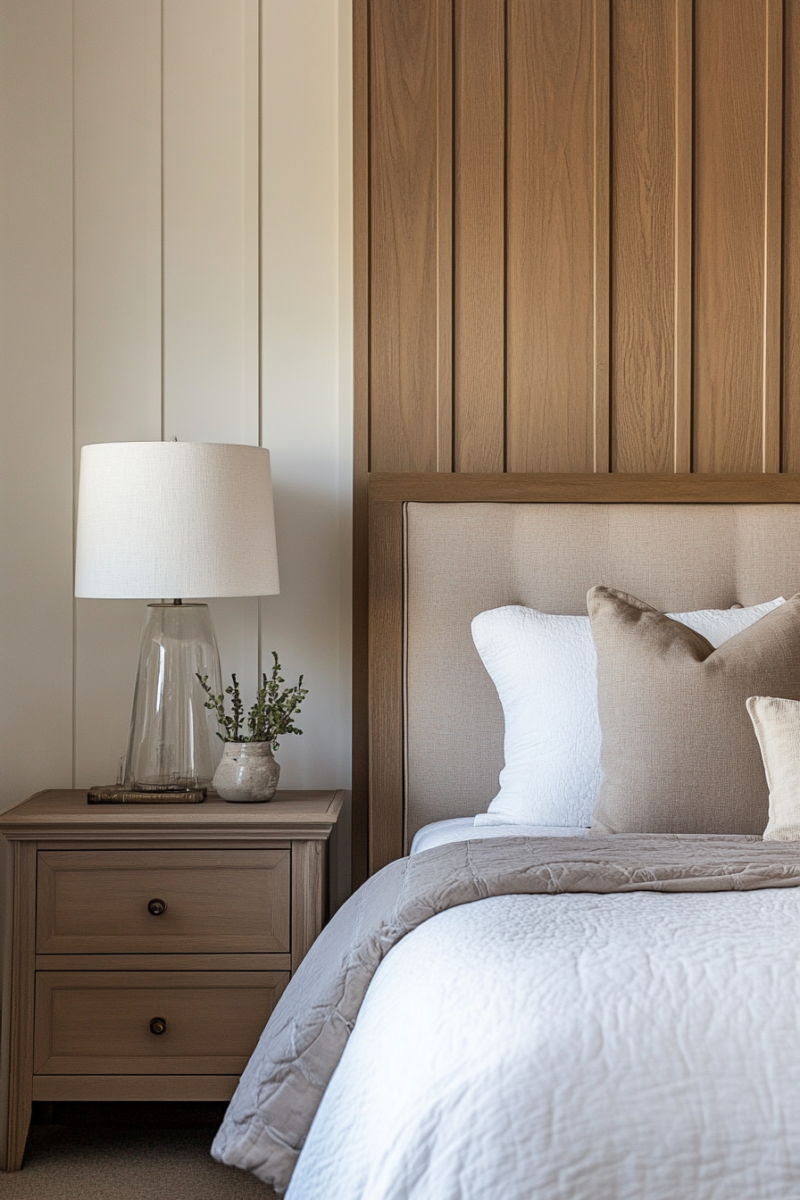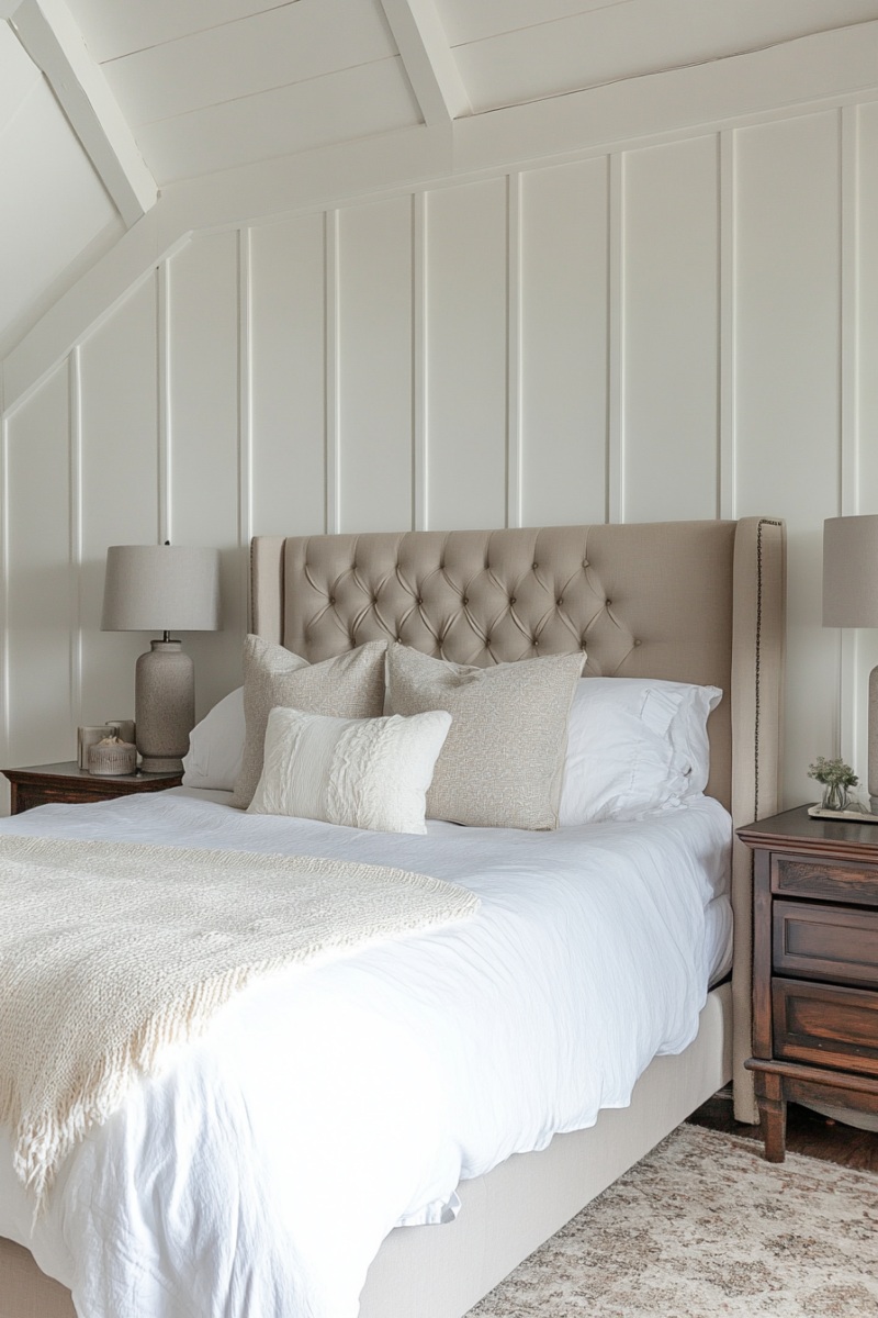 The board and batten headboard makes a stylish, rustic statement as the focal point in a bedroom retreat.