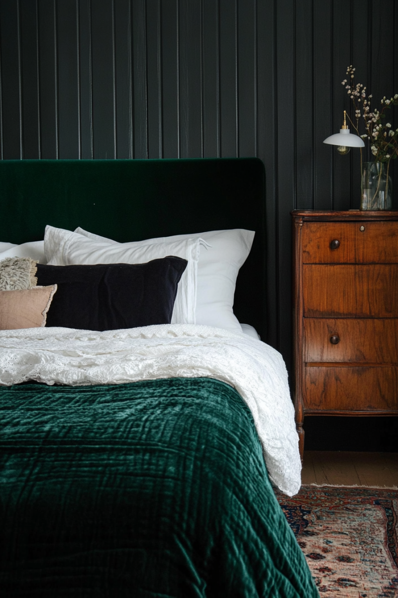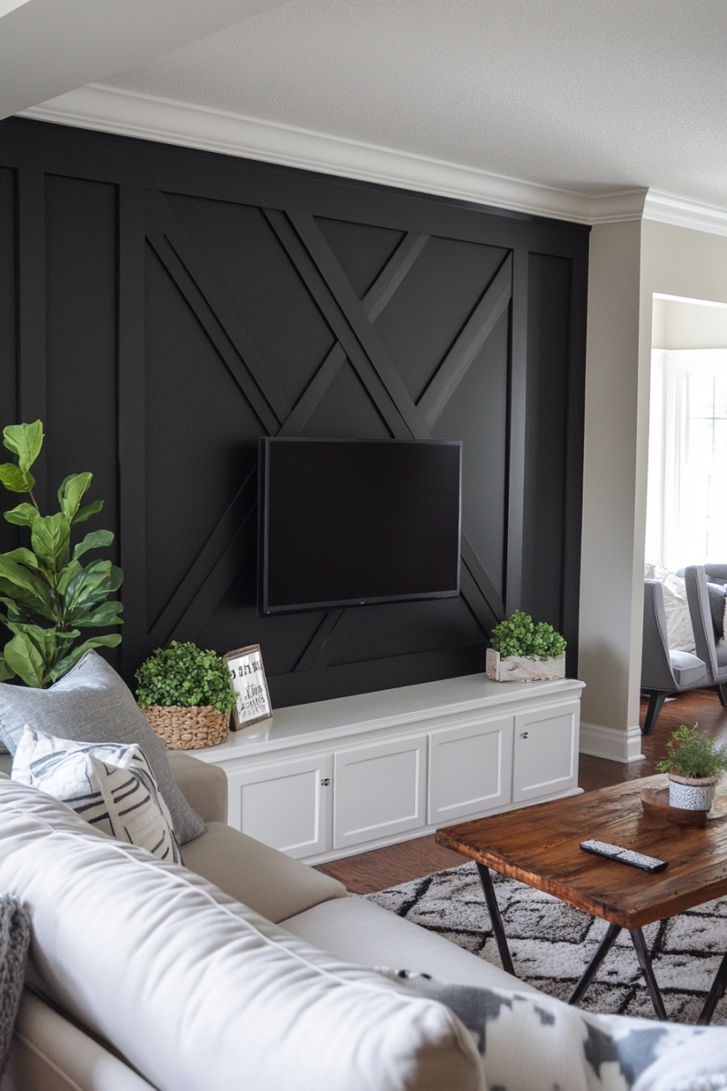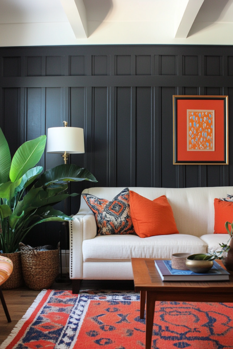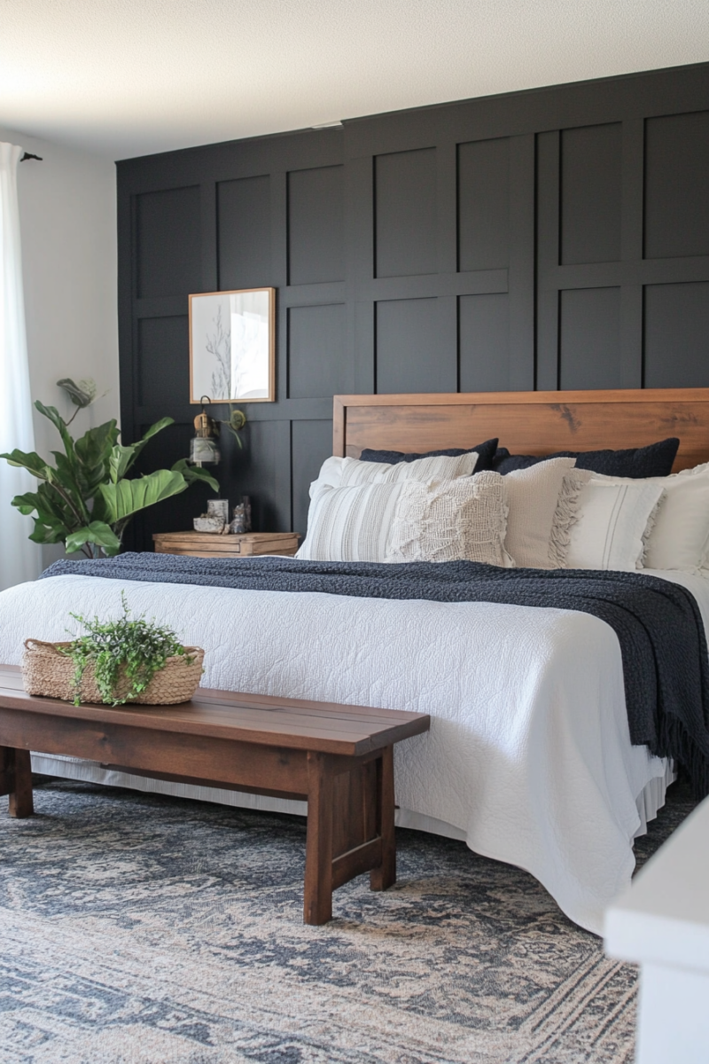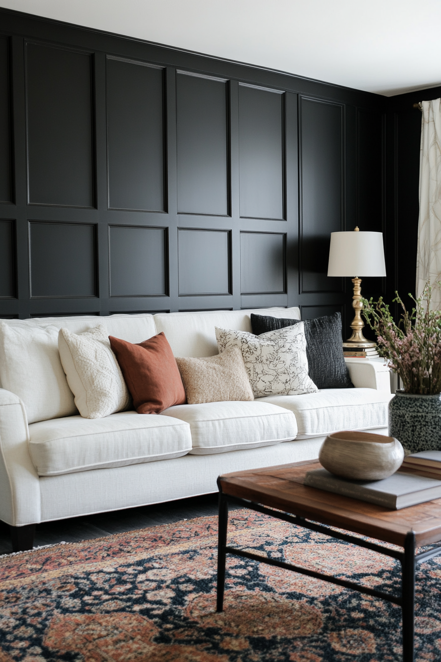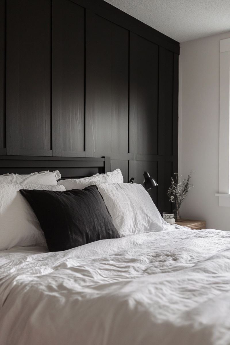 For example, a matte black board-and-batten wall behind a white bedframe or a beige couch creates a stunning contrast.
