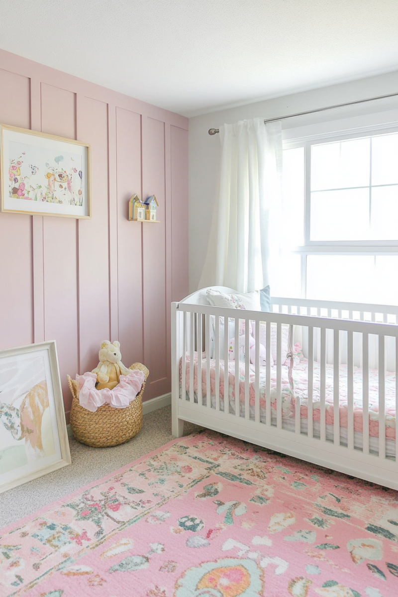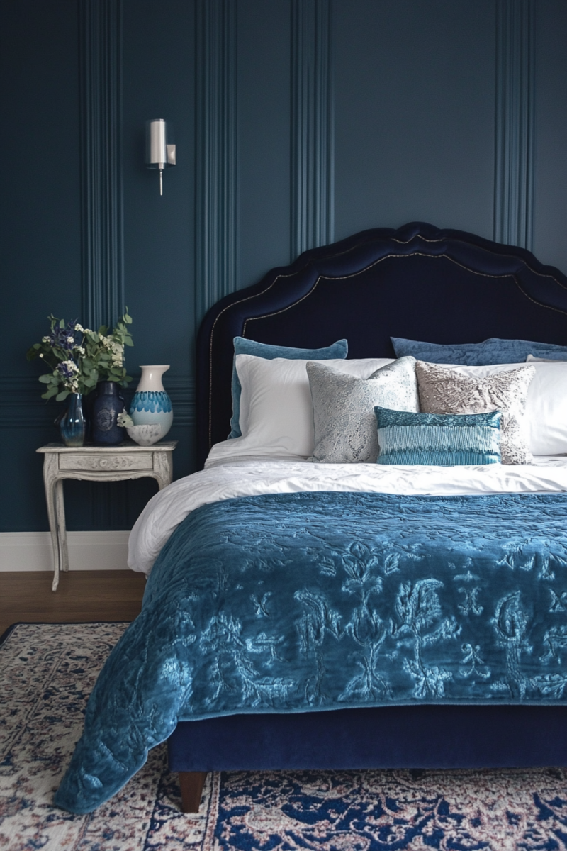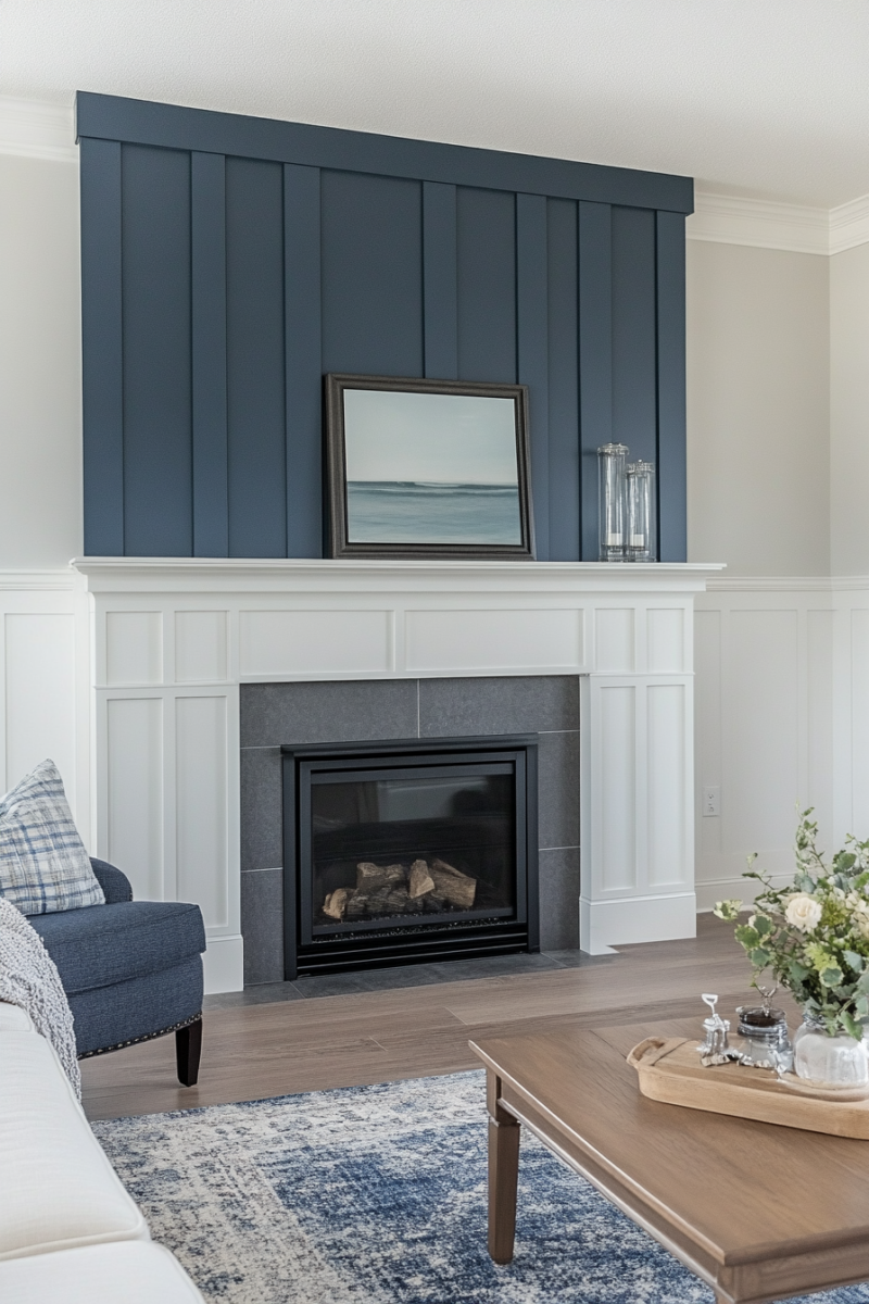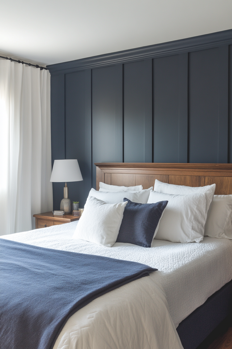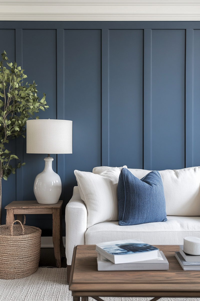 For example, a navy blue board-and-batten wall pairs beautifully with white furniture and gold accents.