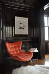 Outfit the space with a mix of wood tones, black metals, and pops of colors like citrine yellow or periwinkle blue to accent the moody charcoal backdrop.