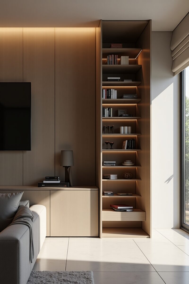 When fully closed, the system shows only the front panel, presenting a clean, minimalist appearance that conceals the extensive collection behind it.