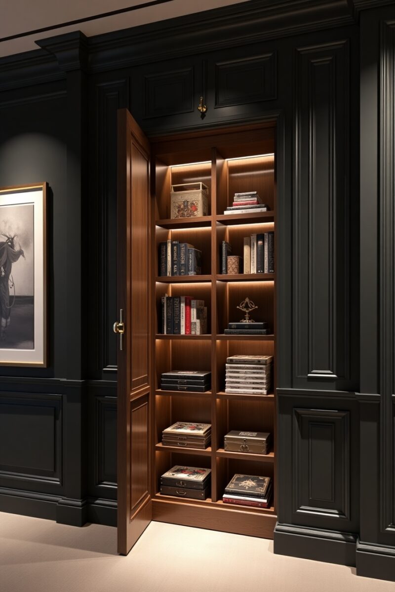 The hidden room behind can be outfitted with custom shelving, lighting, and climate control to protect delicate game components from temperature and humidity fluctuations.