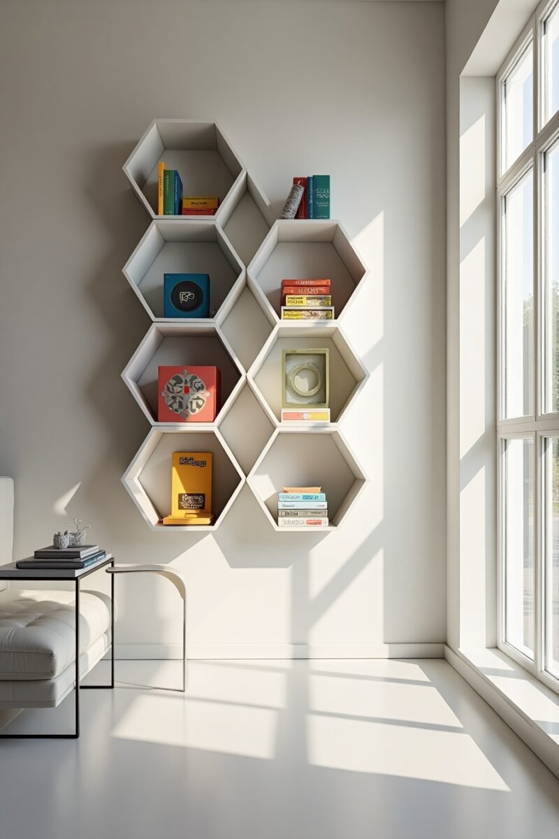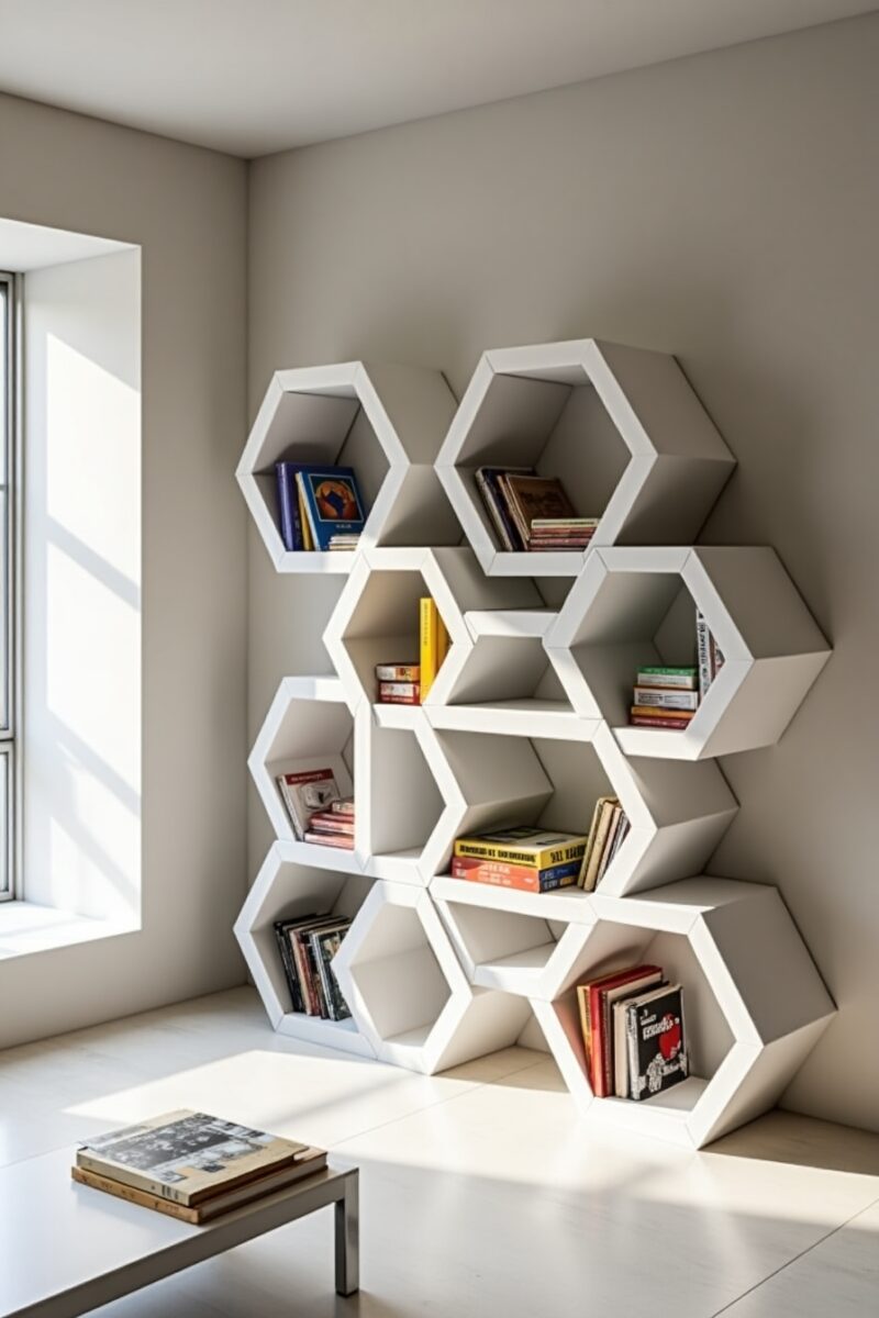 The hexagonal shape references gaming aesthetics while providing more interesting visual variety than standard square and rectangular shelving units.