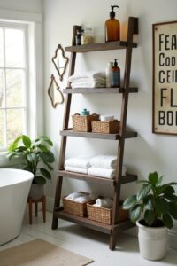Attach a vintage ladder vertically on the wall with baskets to hold toilet paper rolls.