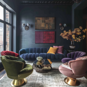 Earthy tones like deep greens, burnt orange, crimson red or midnight blue work well.