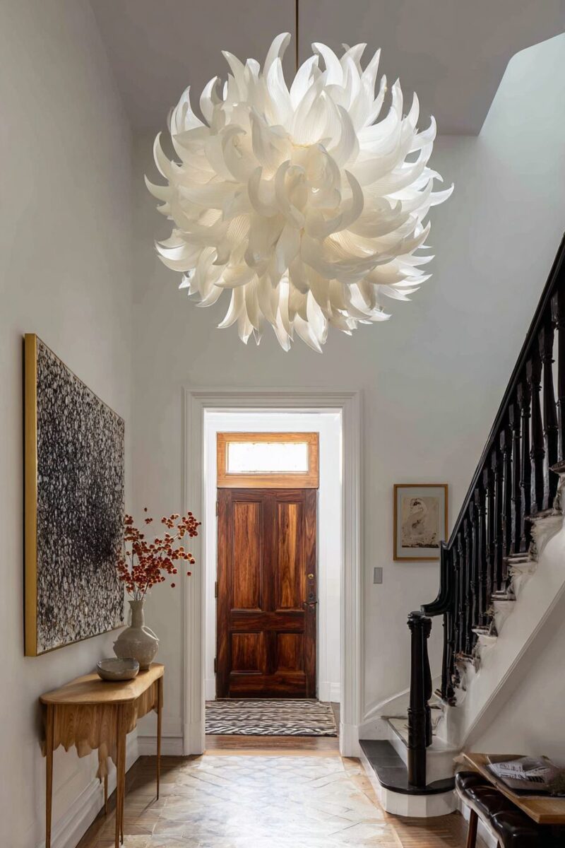 An oversized chandelier or sculptural light fixture becomes the undeniable focal point of your entryway.