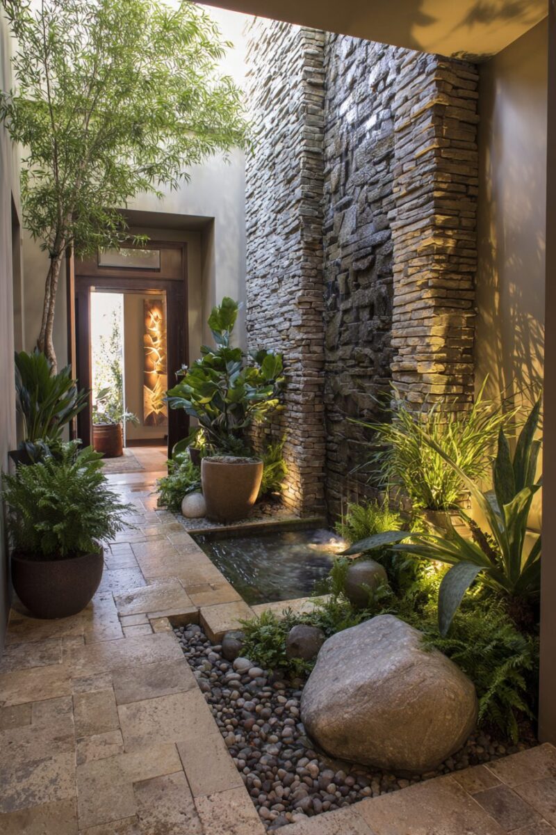 Water features aren’t just for gardens – they create incredible sensory experiences that transform your entryway into a zen-like retreat.