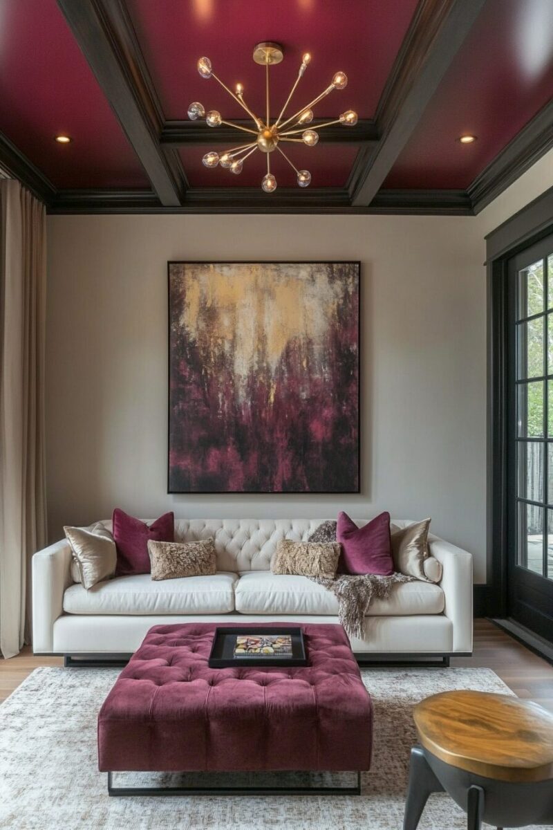 For the truly bold designer, painting your ceiling burgundy creates a dramatic statement that transforms your living room into a truly unique space.