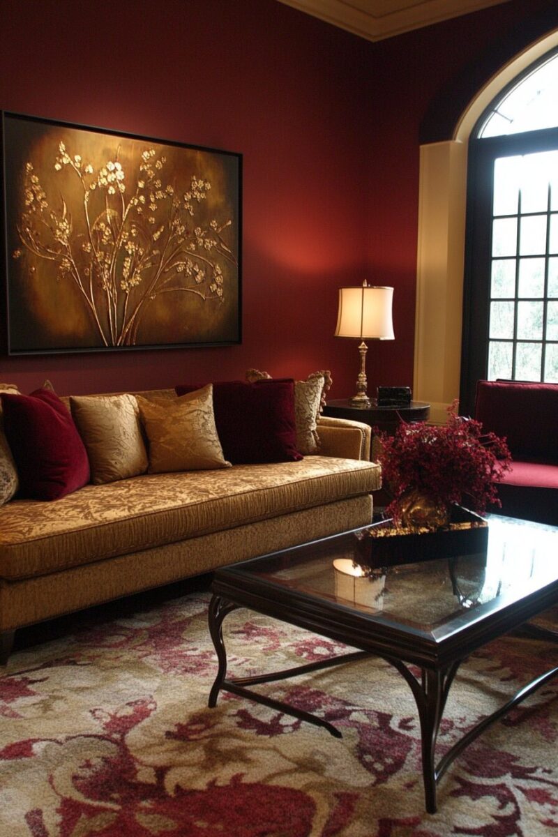 For the walls, consider a matte burgundy feature wall behind your sofa, while keeping other walls in complementary neutrals to prevent the space from feeling overwhelming.