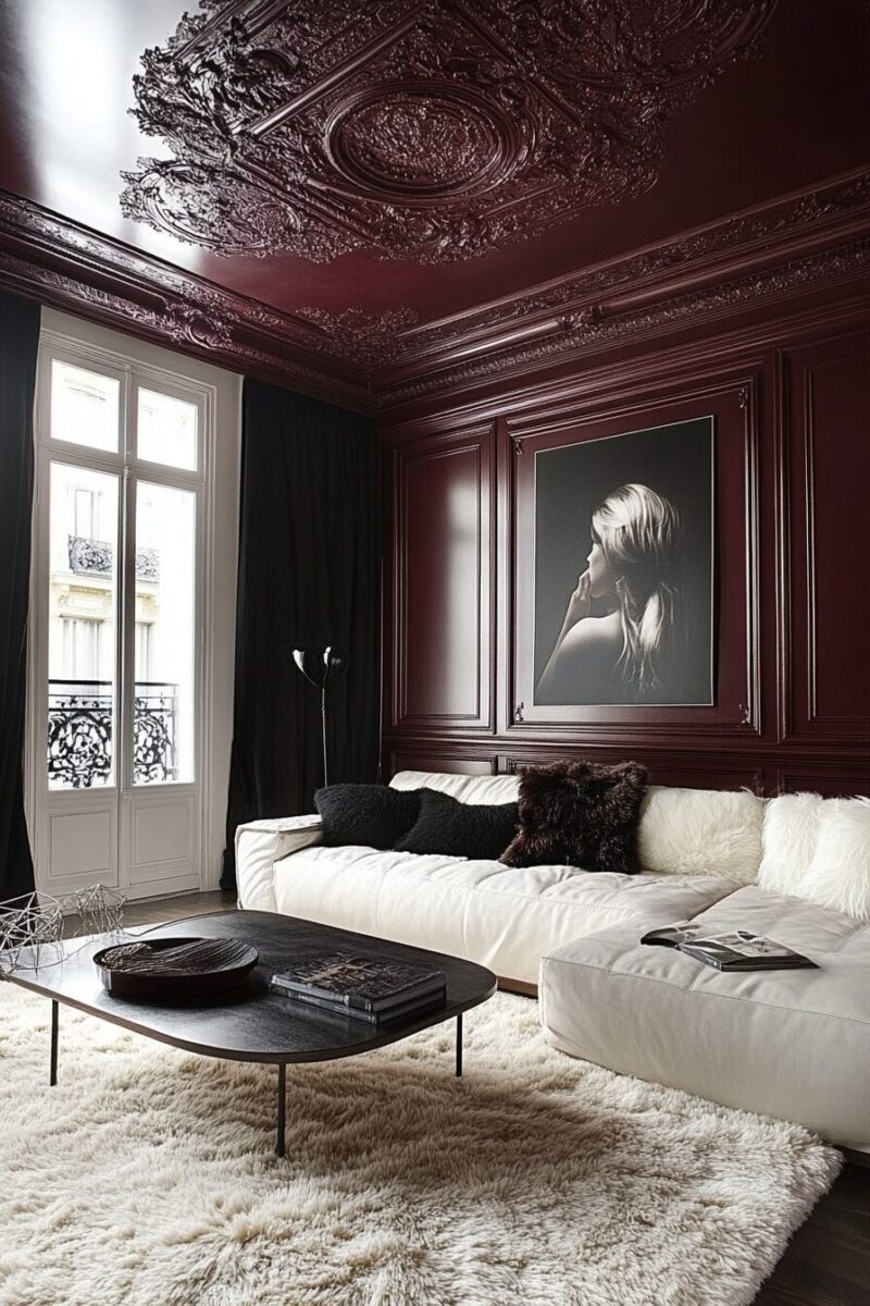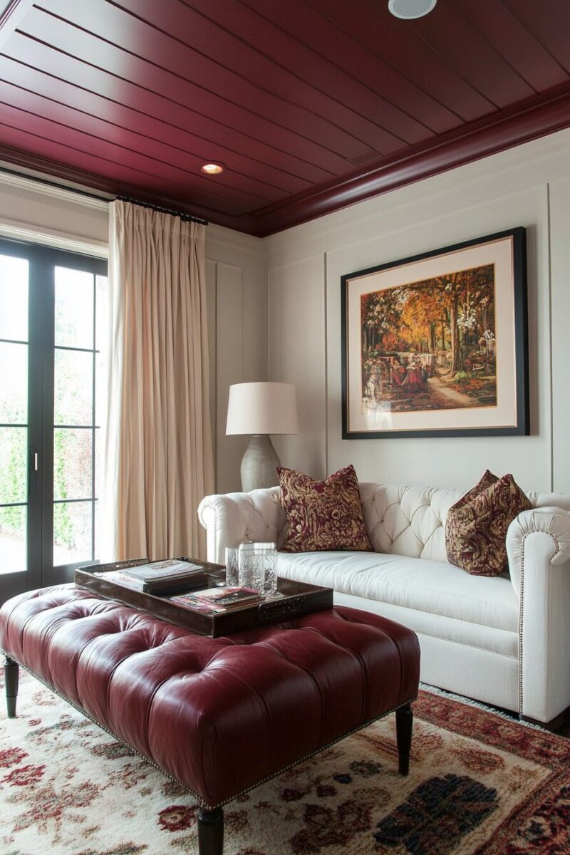 Pair your burgundy ceiling with light walls – crisp white or soft cream creates the perfect contrast that prevents the space from feeling closed in.