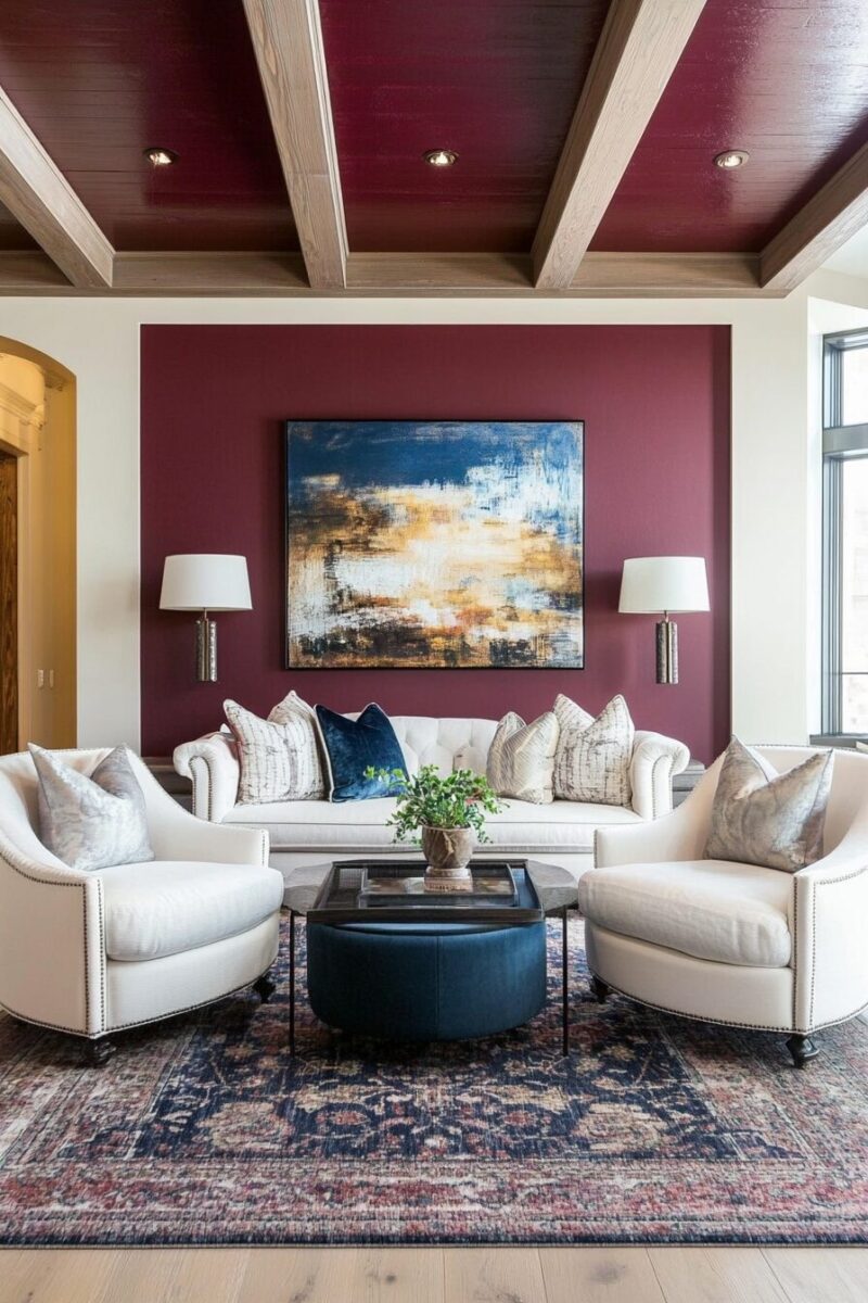 Area rugs that incorporate touches of burgundy help connect your ceiling to the floor, creating a cohesive design that feels intentional rather than random.