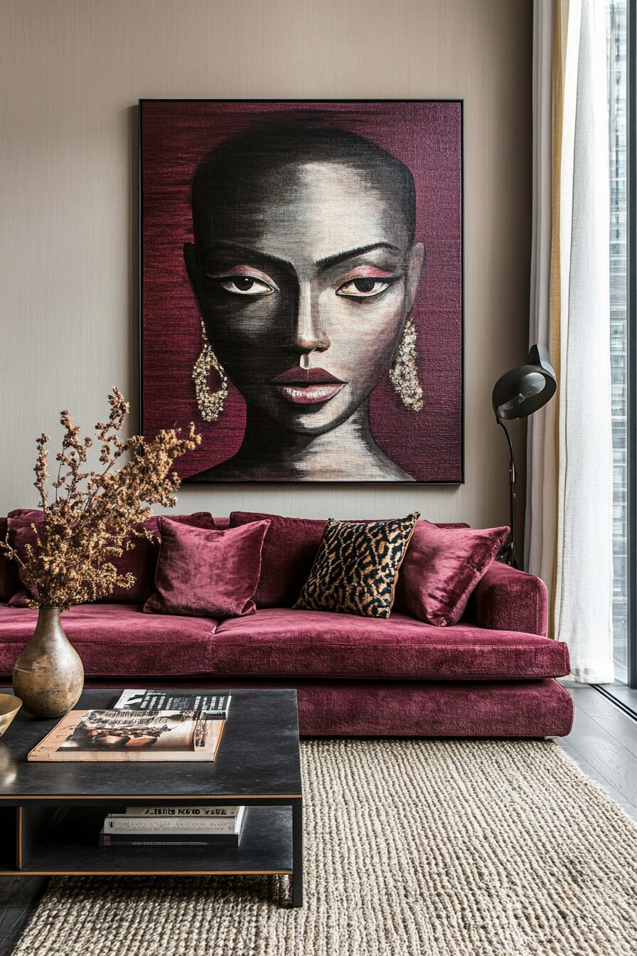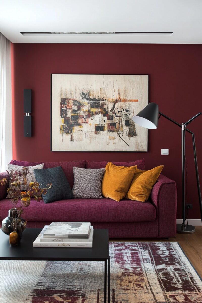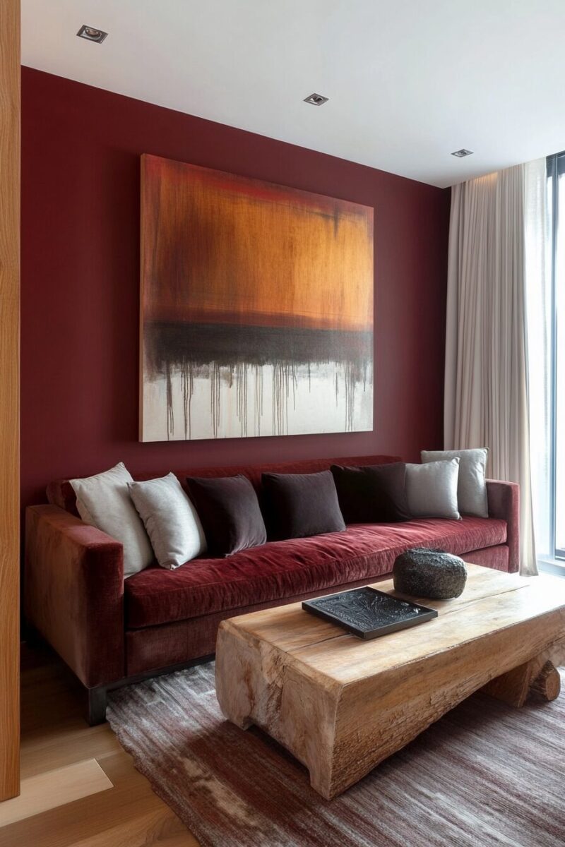 Start with wall art as your main burgundy element – abstract canvases with burgundy as the dominant color create instant focal points against neutral walls.
