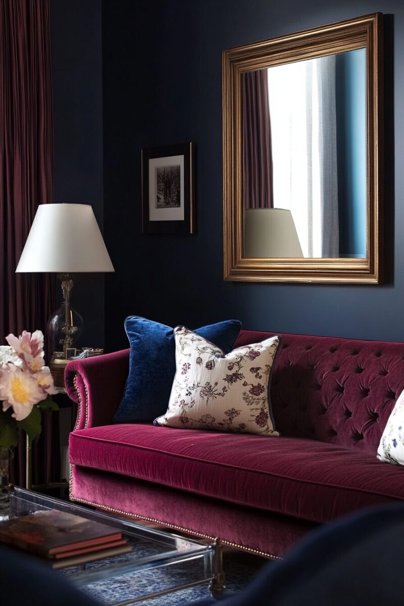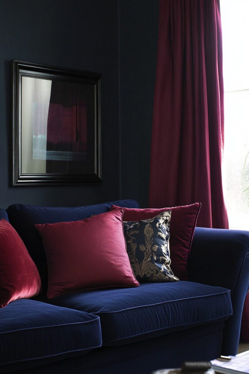 Start with defining which color will dominate – perhaps navy walls with burgundy furniture, or vice versa, establishing a clear hierarchy in your color story.