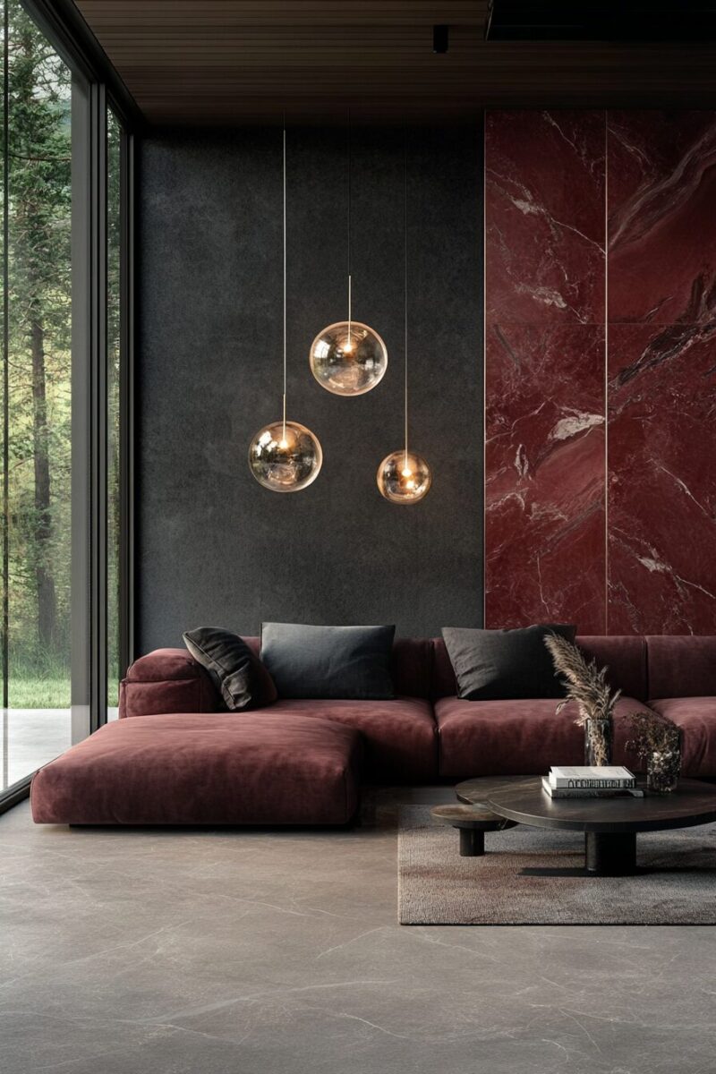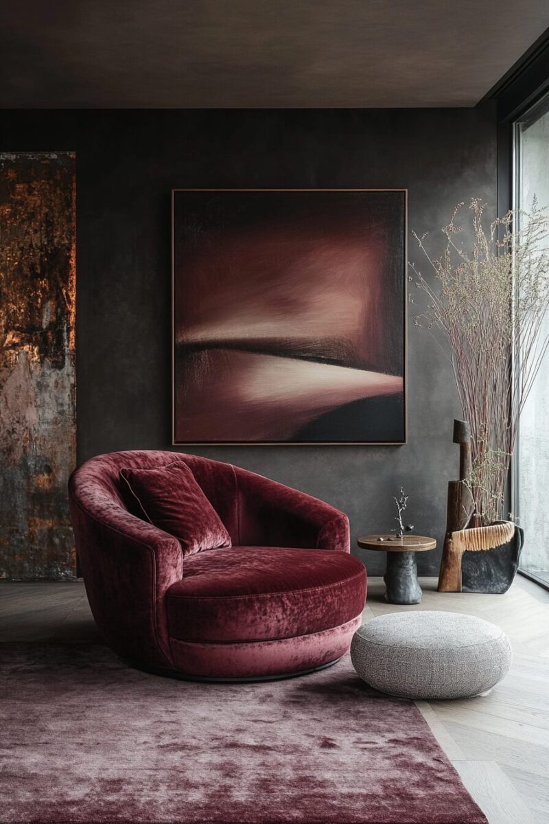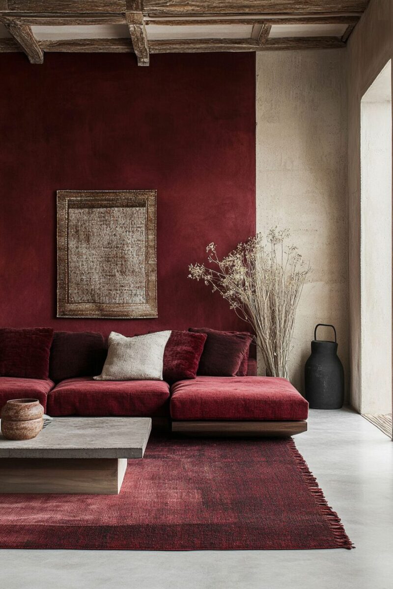 The richness of burgundy perfectly complements the organic textures of wood, stone, leather, and plants, creating a multi-dimensional space.
