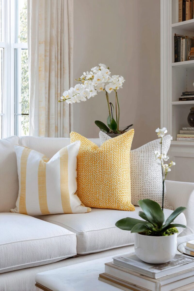 For a seasonal update, swap accessories between summer (more yellow) and winter (more navy) to adjust the room’s feel throughout the year.