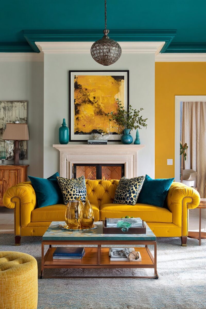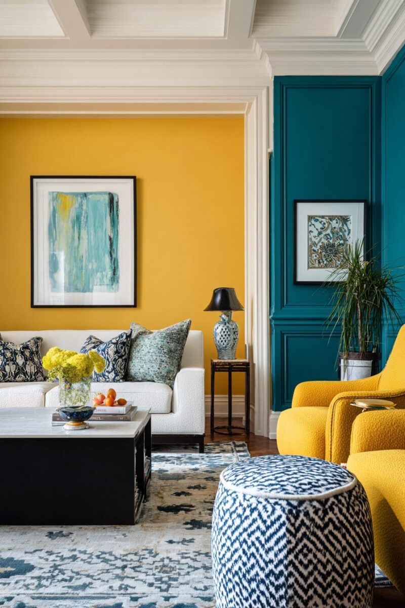 The contrast between warm butter yellow and cool teal creates visual electricity that energizes your living room while maintaining an elegant balance.