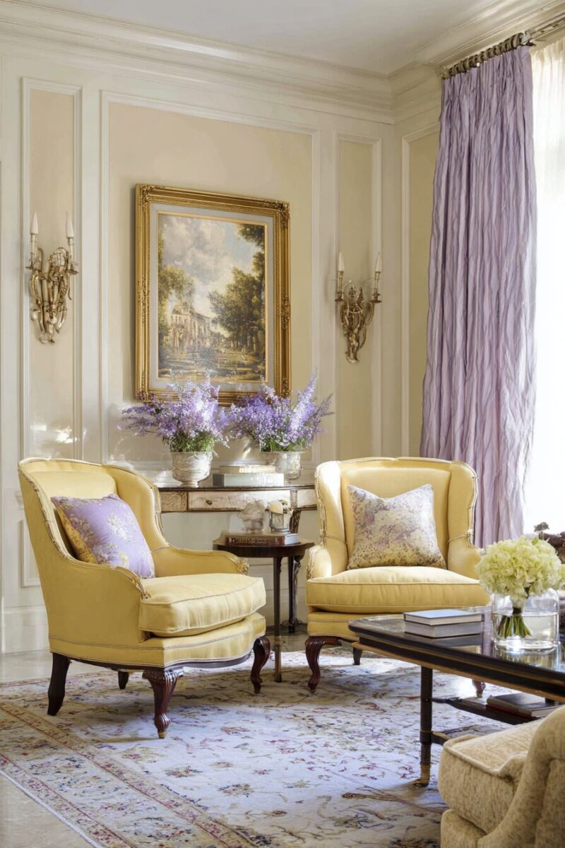 The femininity often associated with lavender is beautifully balanced by the gender-neutral quality of butter yellow, creating spaces that appeal to everyone.