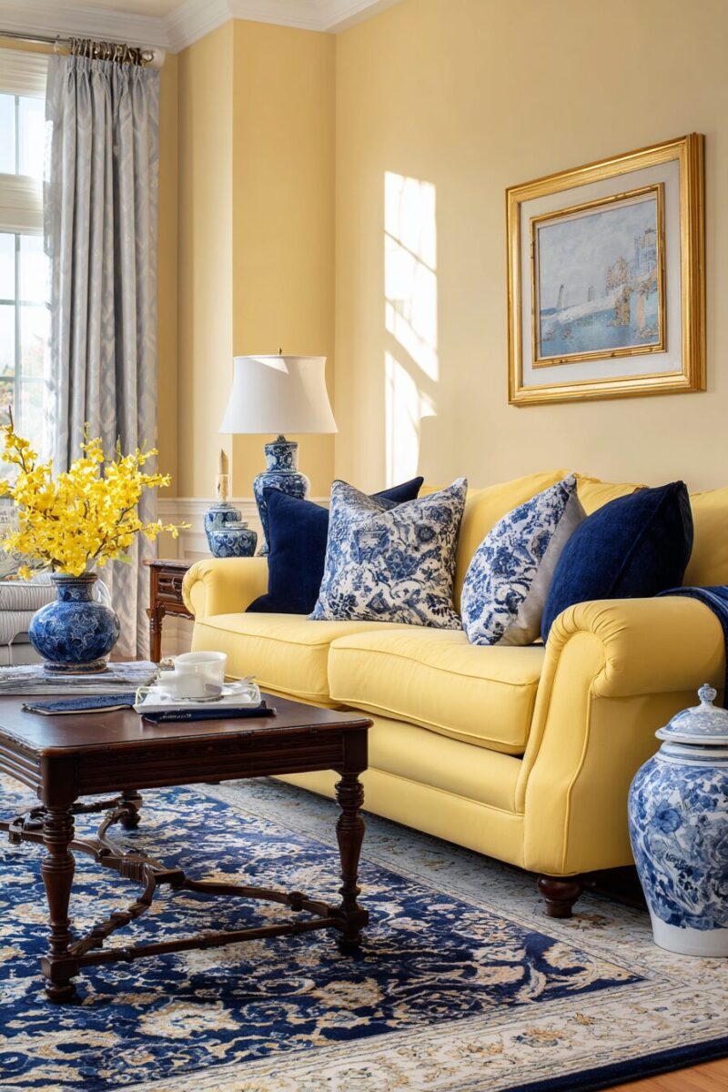 This combination works particularly well in living rooms that receive ample natural light, as it enhances the sunny quality of the yellow while preventing the navy from feeling too dark.