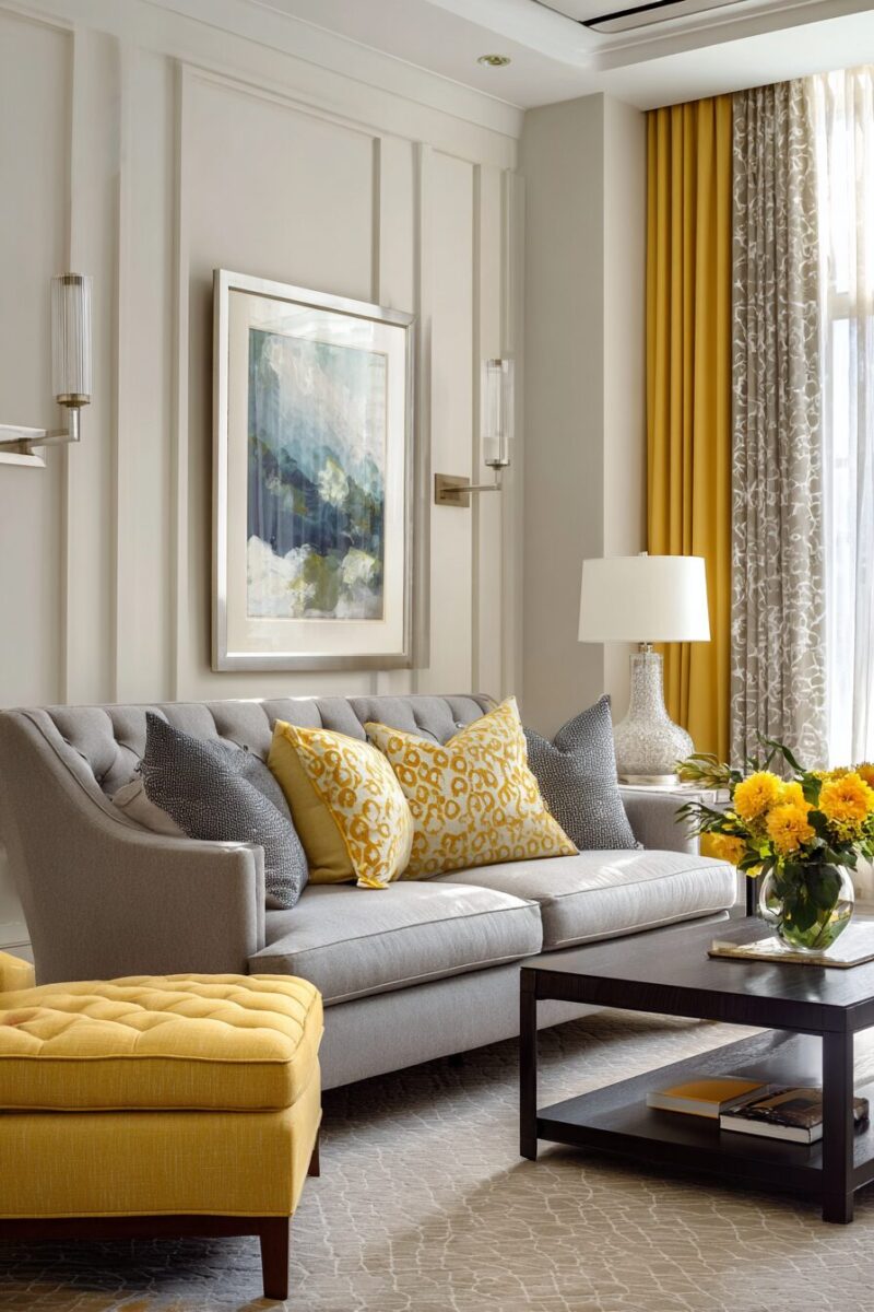 The pairing of butter yellow with gray creates an instantly sophisticated atmosphere that feels both contemporary and timeless.