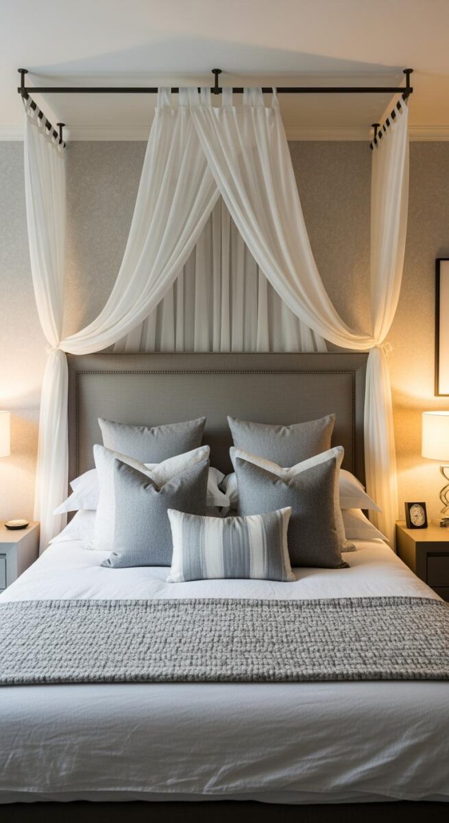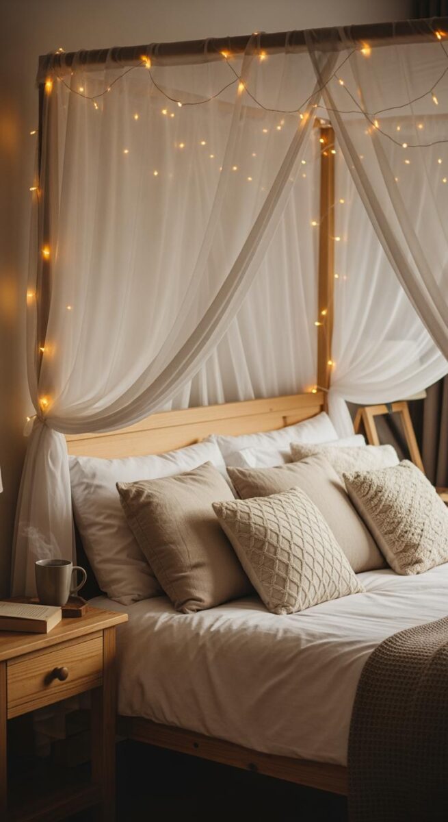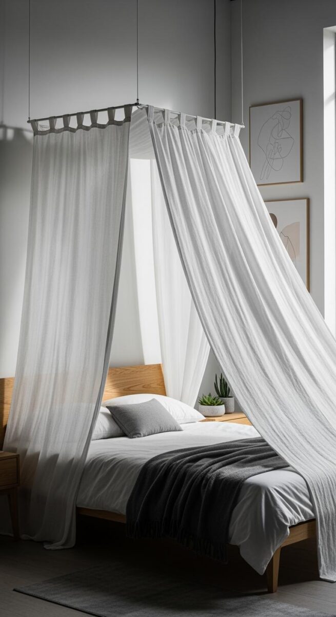 Sometimes just the headboard side with fabric flowing down creates that soft, canopy feeling without overwhelming a smaller room.