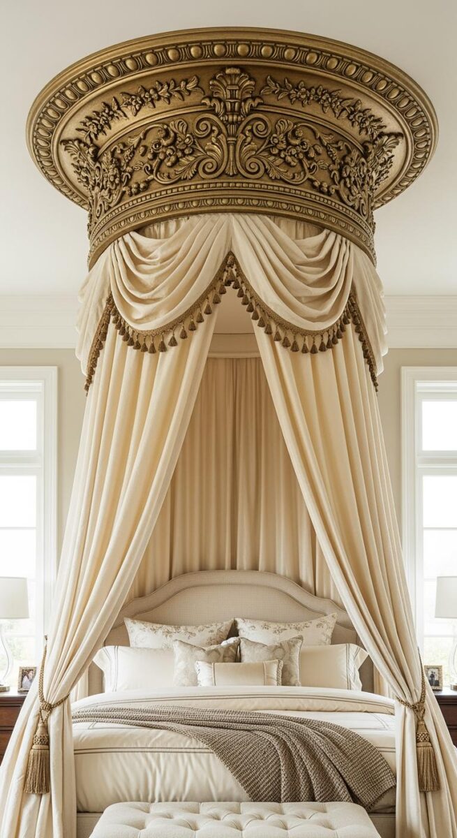 You mount a decorative ceiling medallion or a crown-style fixture, and the fabric drapes down from that central point.