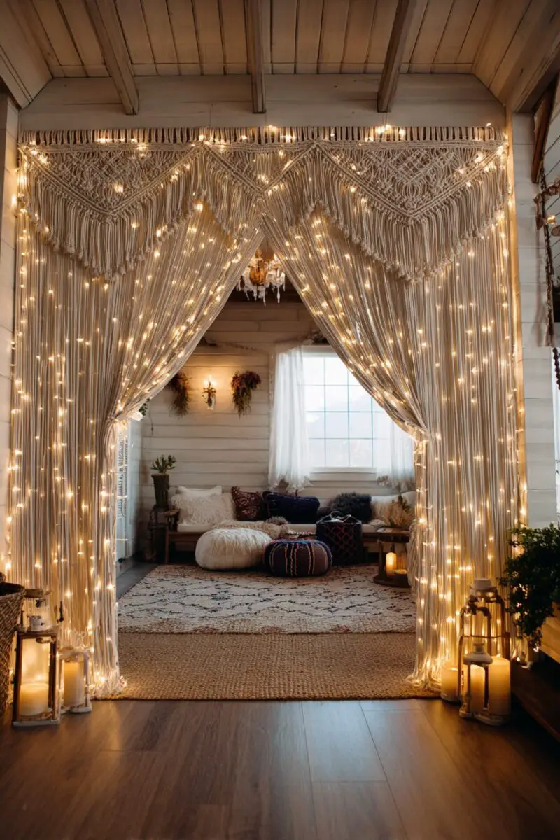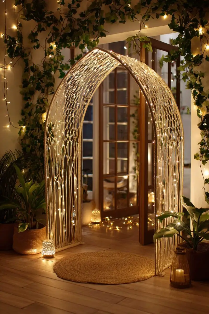 Weave warm white fairy lights throughout the macrame structure, following the natural lines and curves of the rope work.