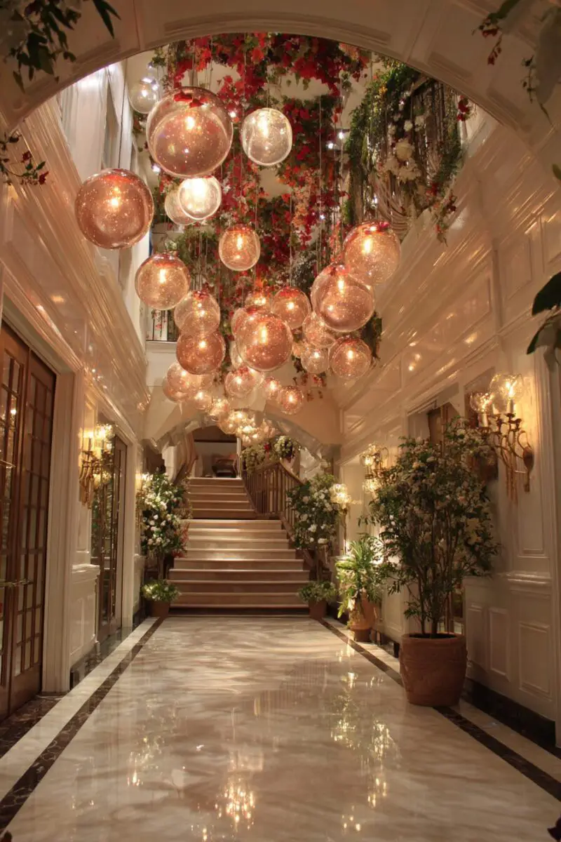 Map out your ceiling space and plan ornament placement to create a flowing, arch-like pattern overhead.