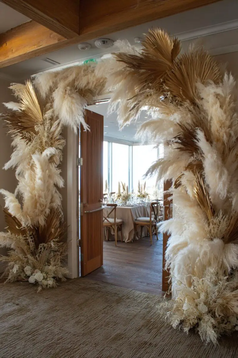 Create your arch shape using a sturdy wire frame that can support the weight of multiple large grass plumes.