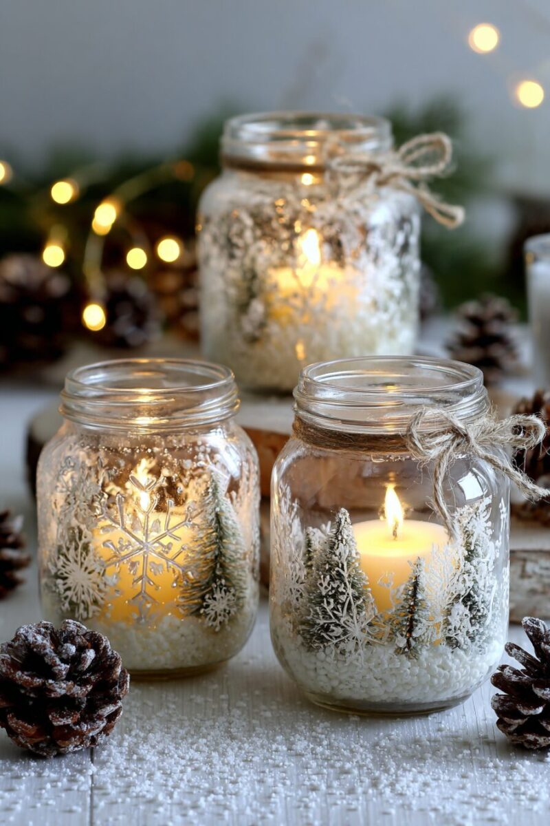 Snowy luminaries bring that peaceful winter glow indoors — as if tiny snowflakes are resting on your jars.