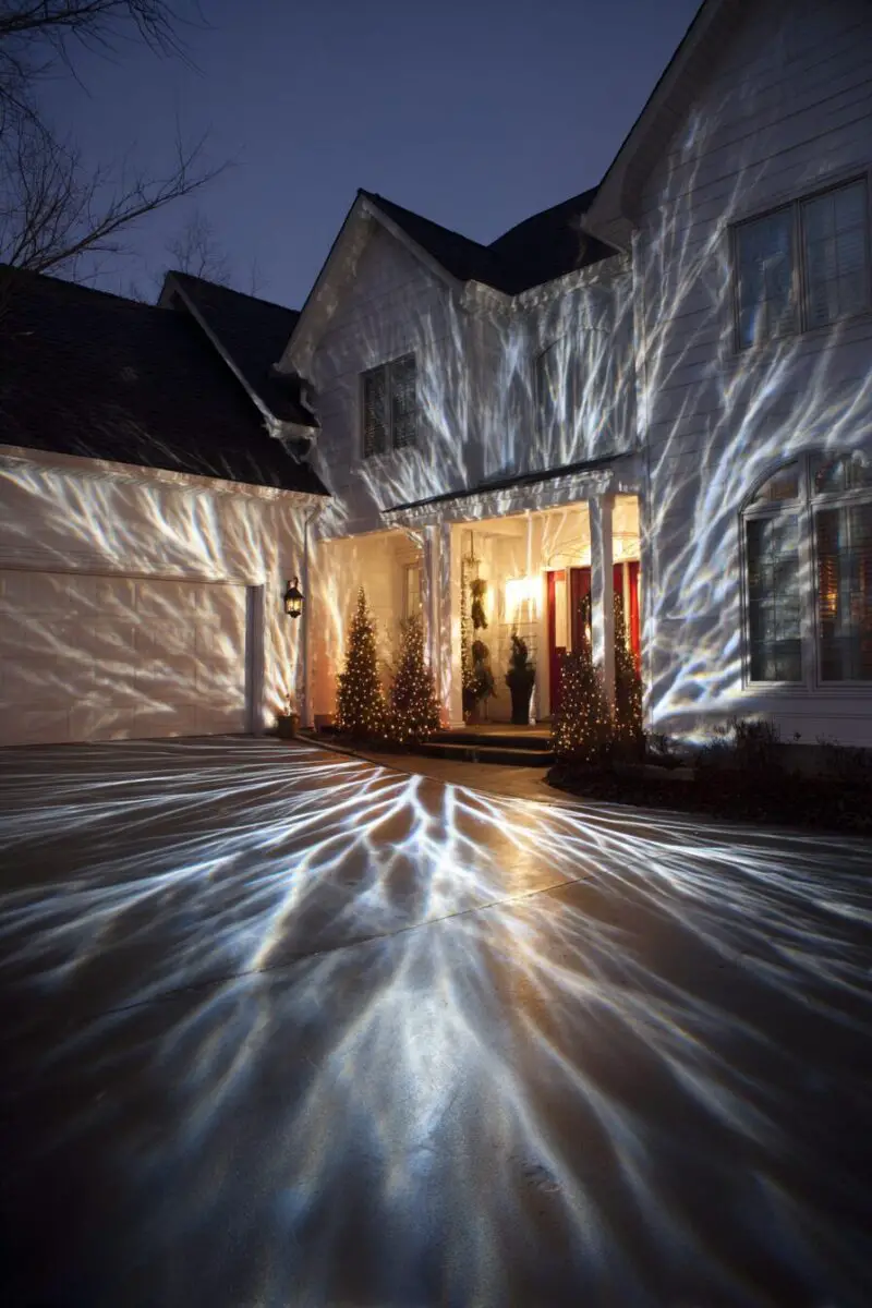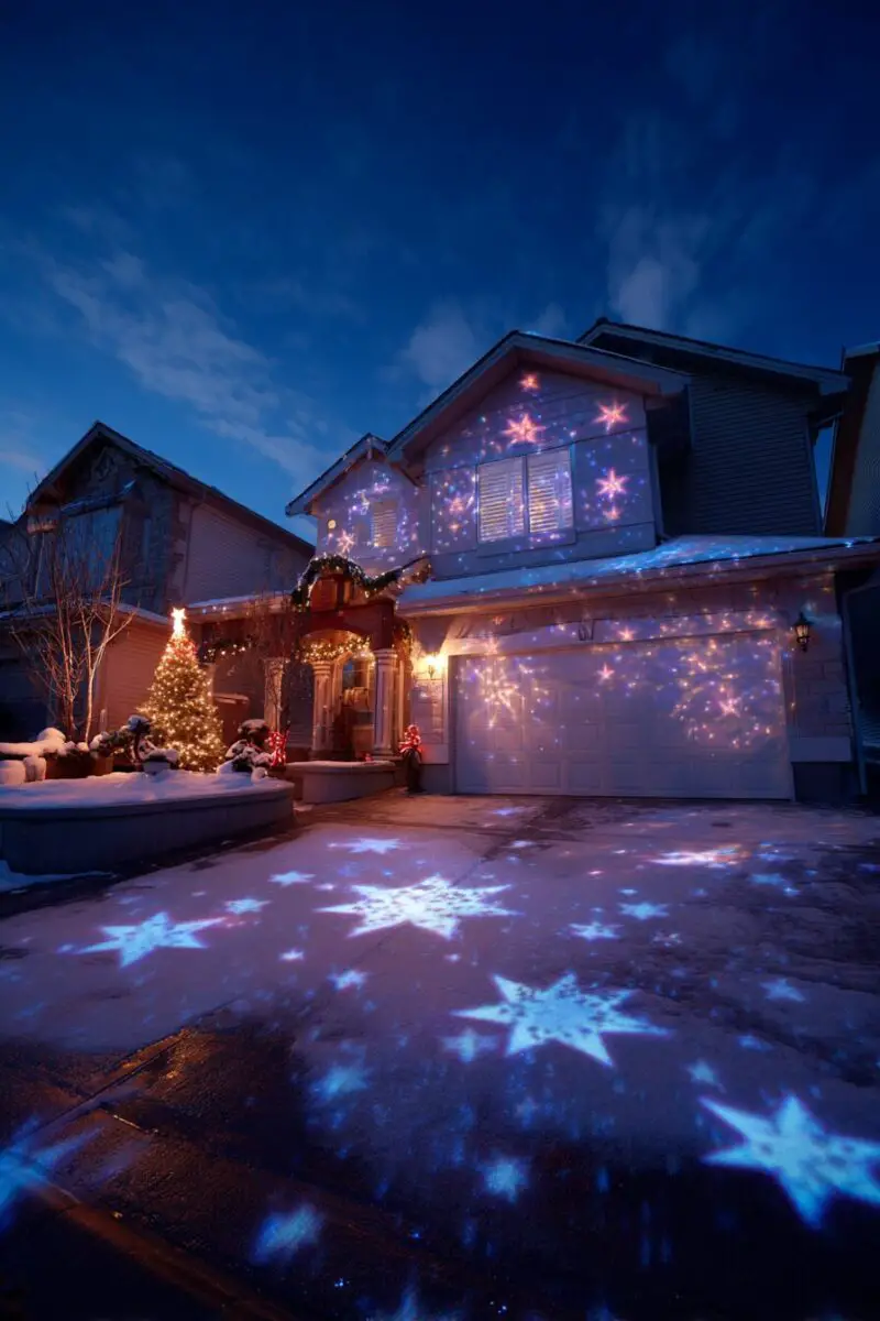 These high-tech devices can project everything from falling snowflakes and twinkling stars to moving reindeer and swirling holiday patterns directly onto your home’s exterior walls.