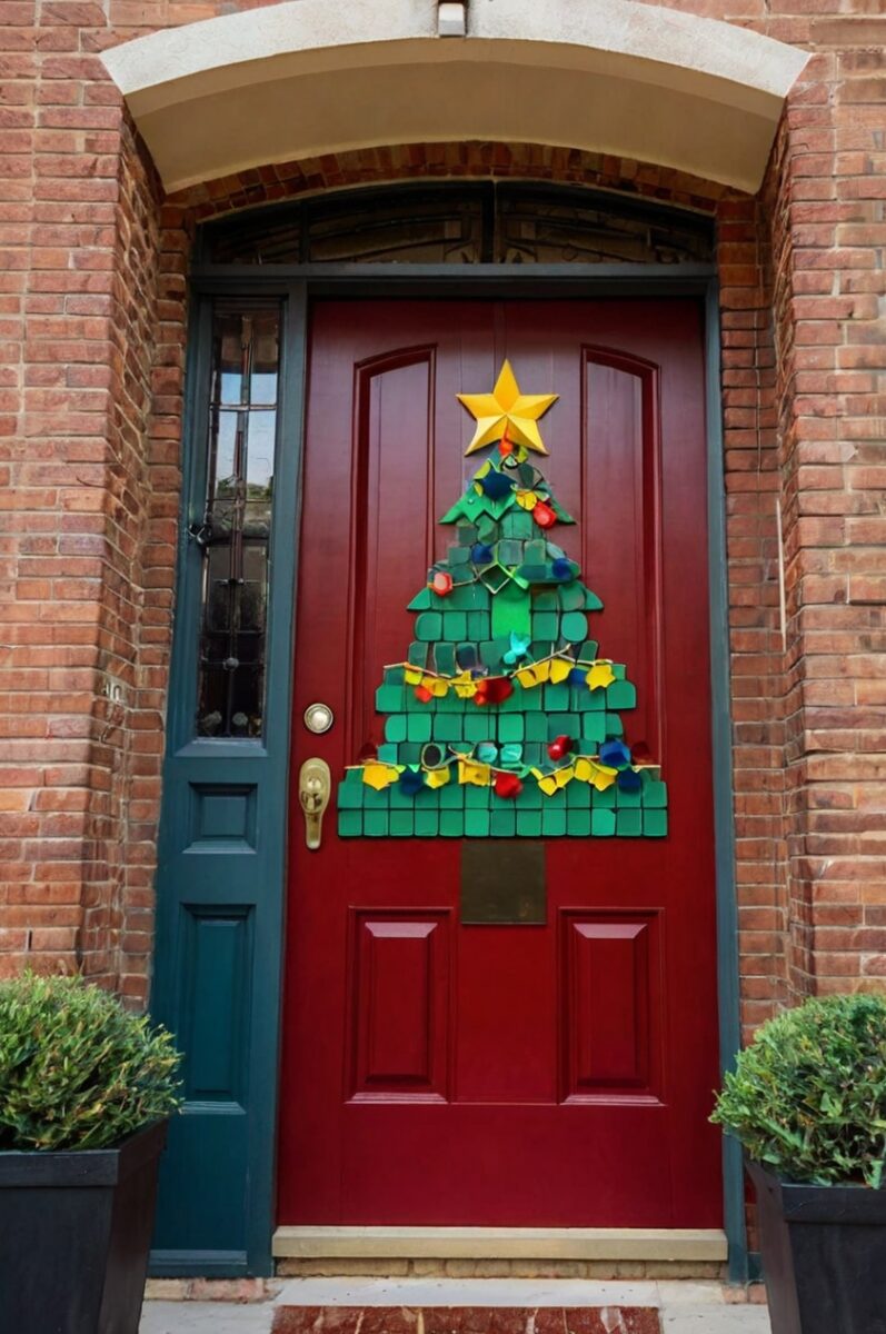 Create a large Christmas tree using small squares of colored paper arranged in pixel formation across your door surface.