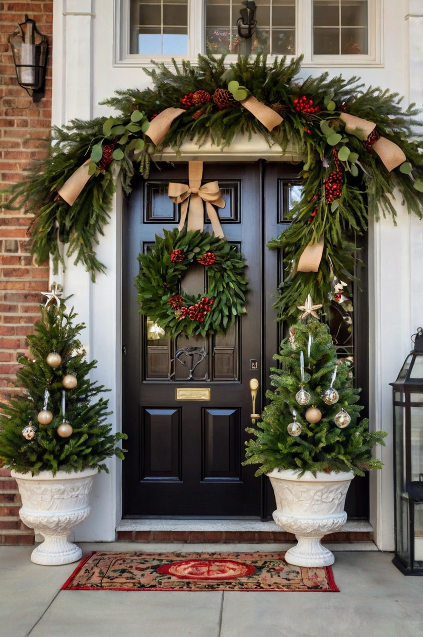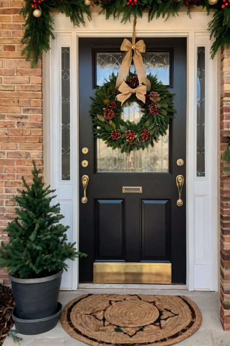 For a front door that’s full of chic, modern holiday style, try a black and white color scheme punctuated with pops of metallic gold or silver.