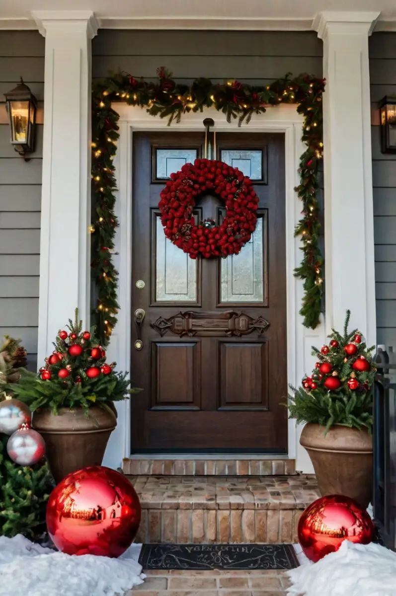 Adorn porch columns and railings with evergreen garlands, pinecones, and red bows.