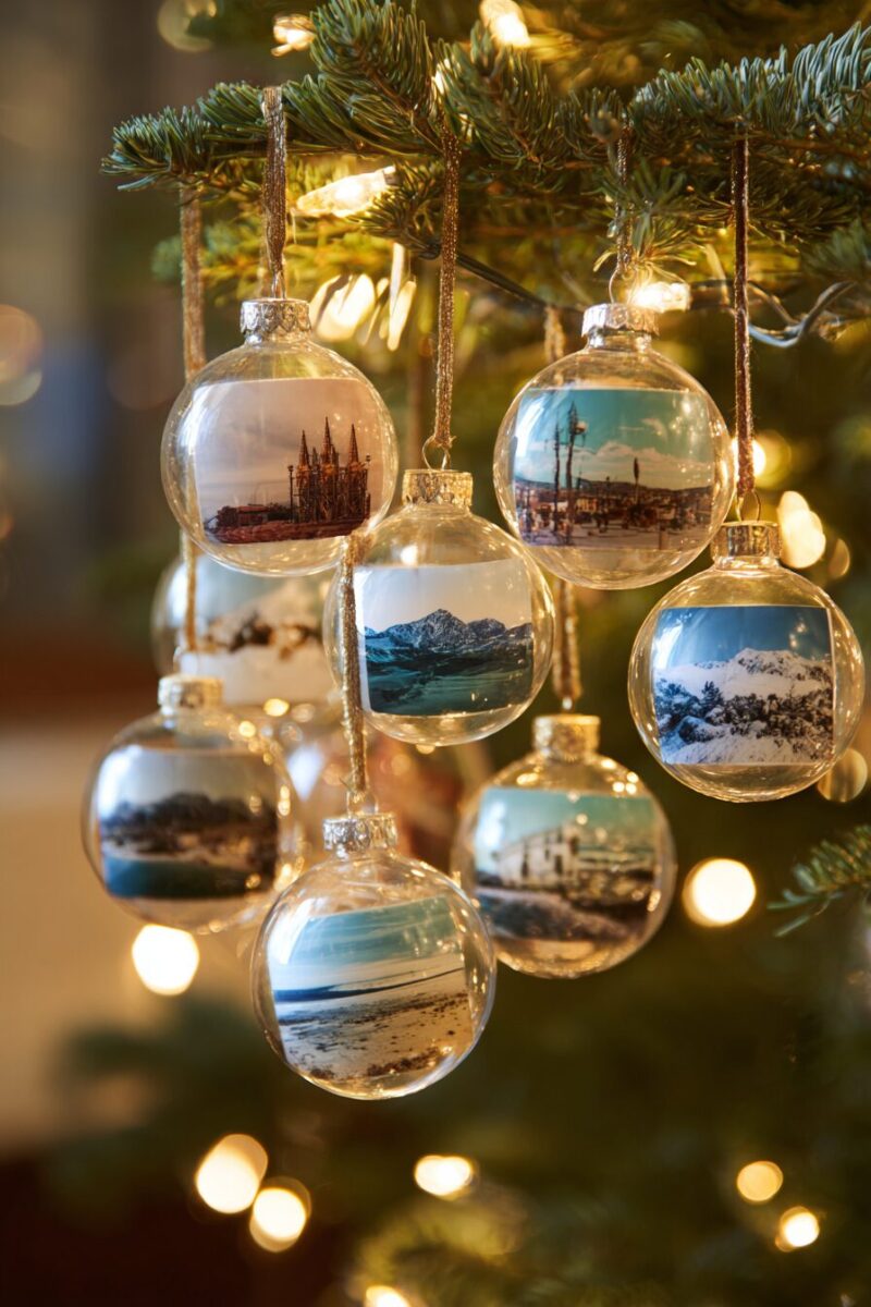 The clear ornaments allow the photos to be visible from multiple angles as they hang and slowly rotate on the tree.