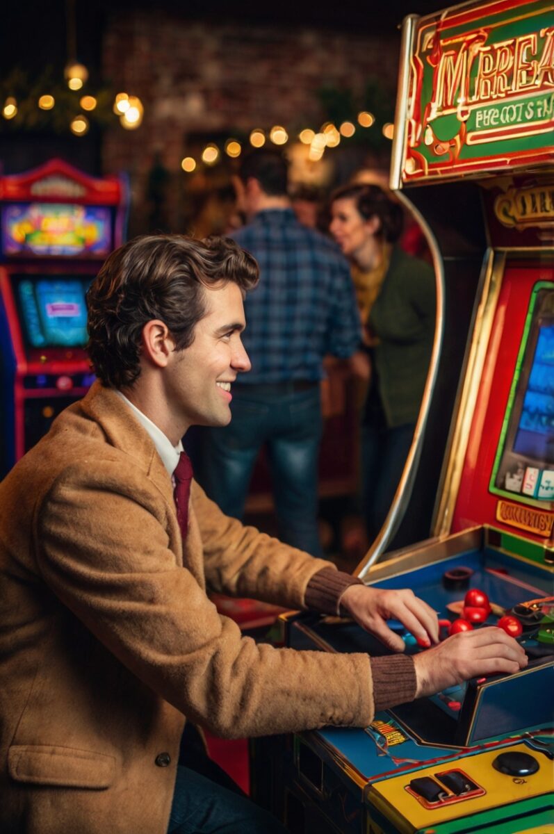 Set up multiple vintage arcade games or gaming stations featuring classic holiday-themed games and retro favorites.