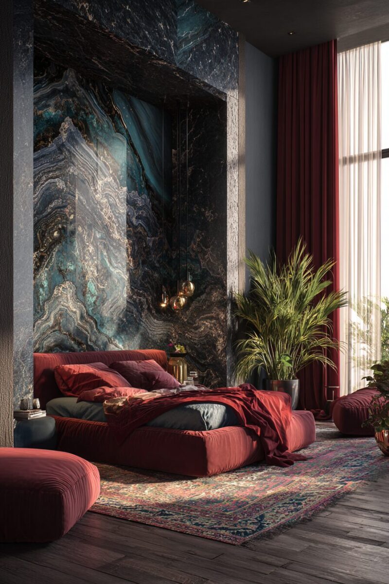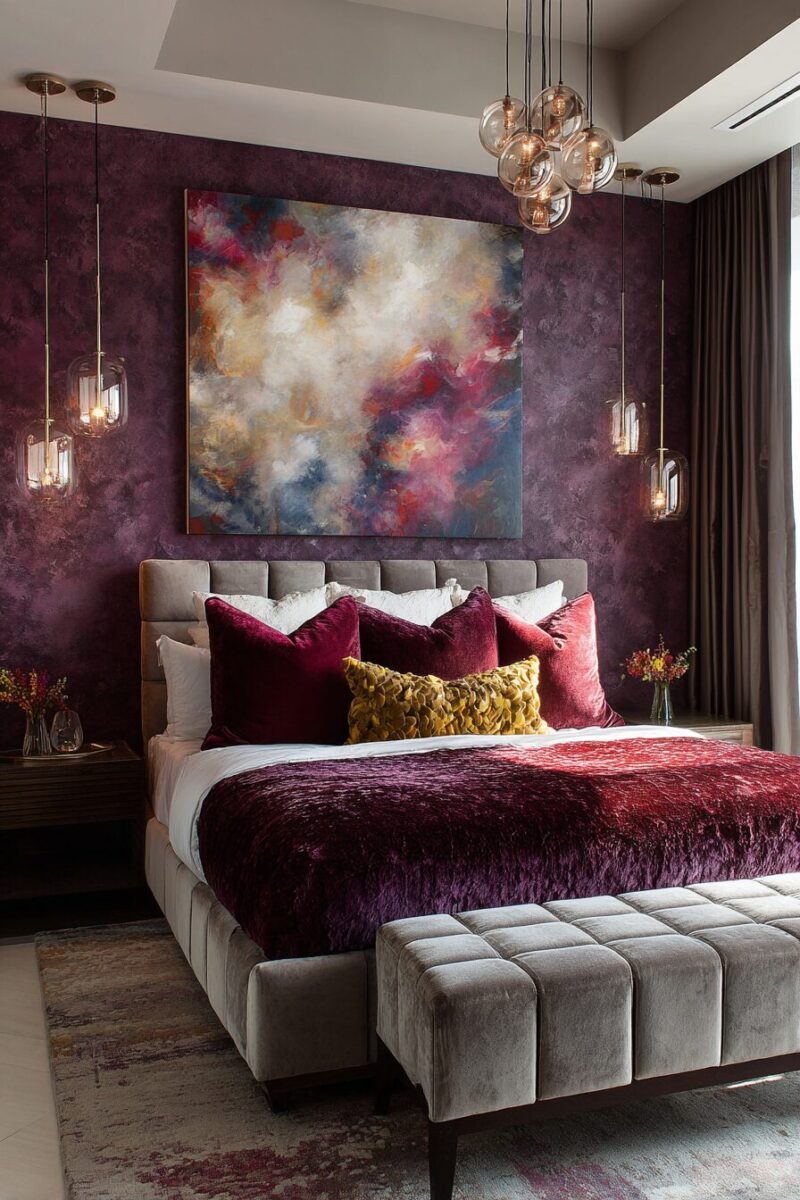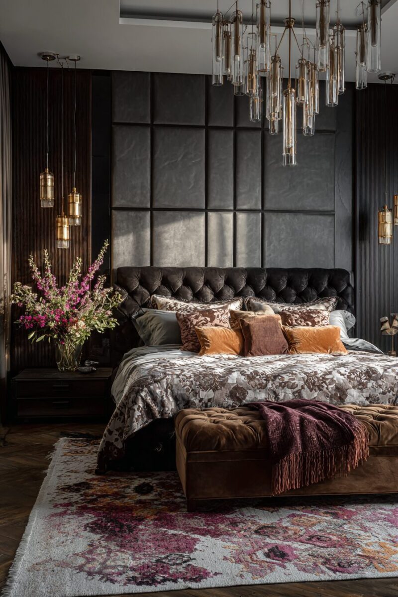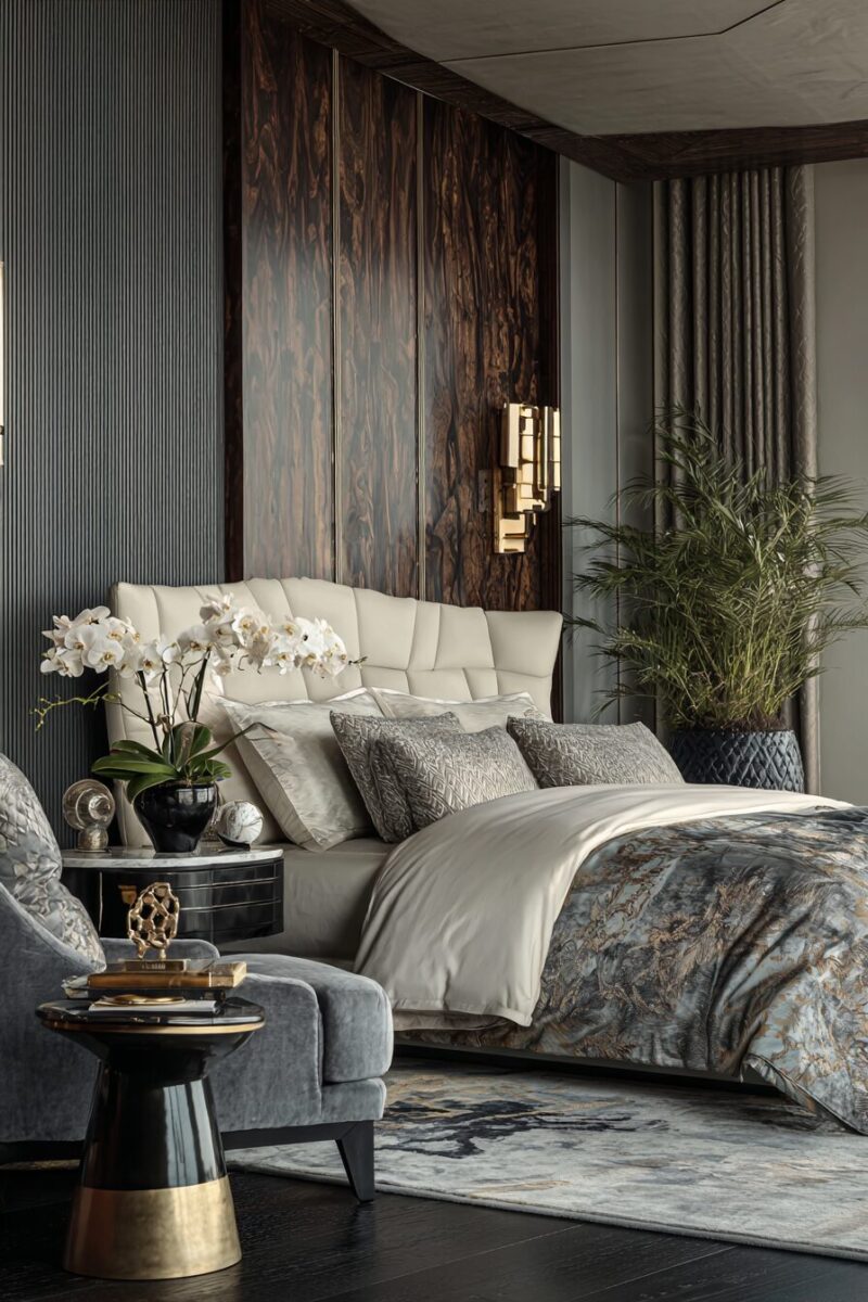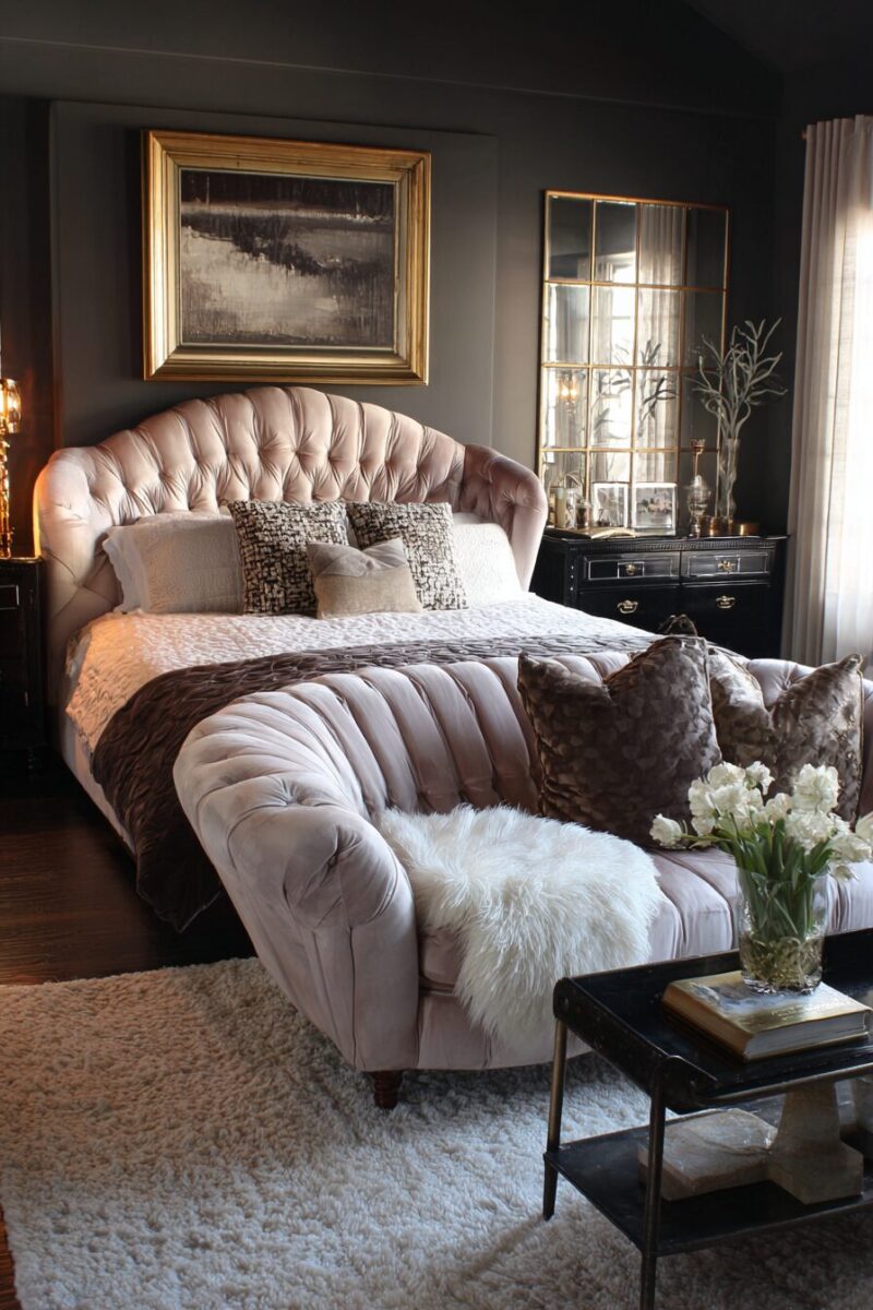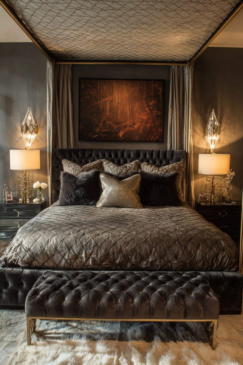 Velvet becomes your best friend in this design scheme, whether through an upholstered headboard, curtains, or accent pillows that catch and reflect light beautifully.