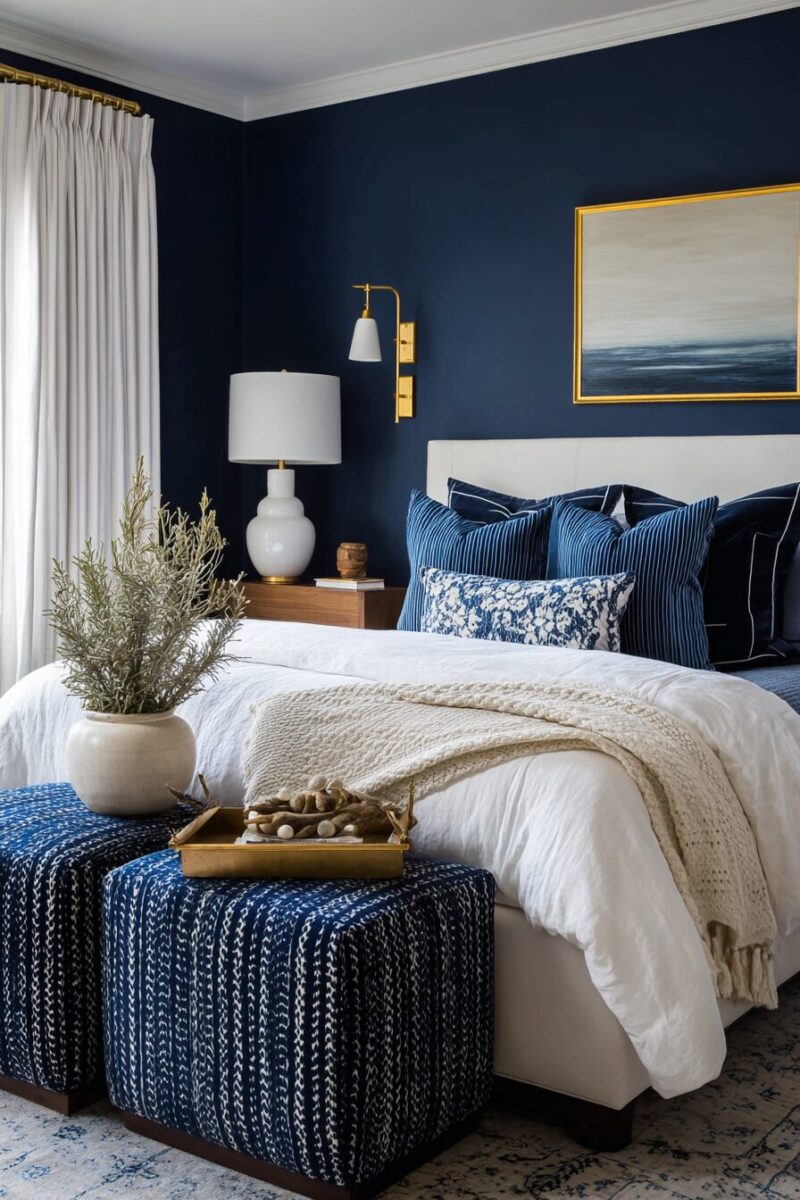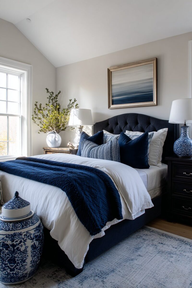 Rich navy blue serves as your dominant color, whether through an upholstered headboard, painted accent wall, or dramatic window treatments that anchor the space.