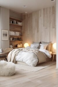 Natural materials take center stage, with light wood furniture and accents that bring warmth and texture to the predominantly neutral palette.