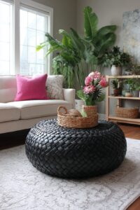 Add handcrafted pieces with global flair like woven baskets or embroidered poufs.